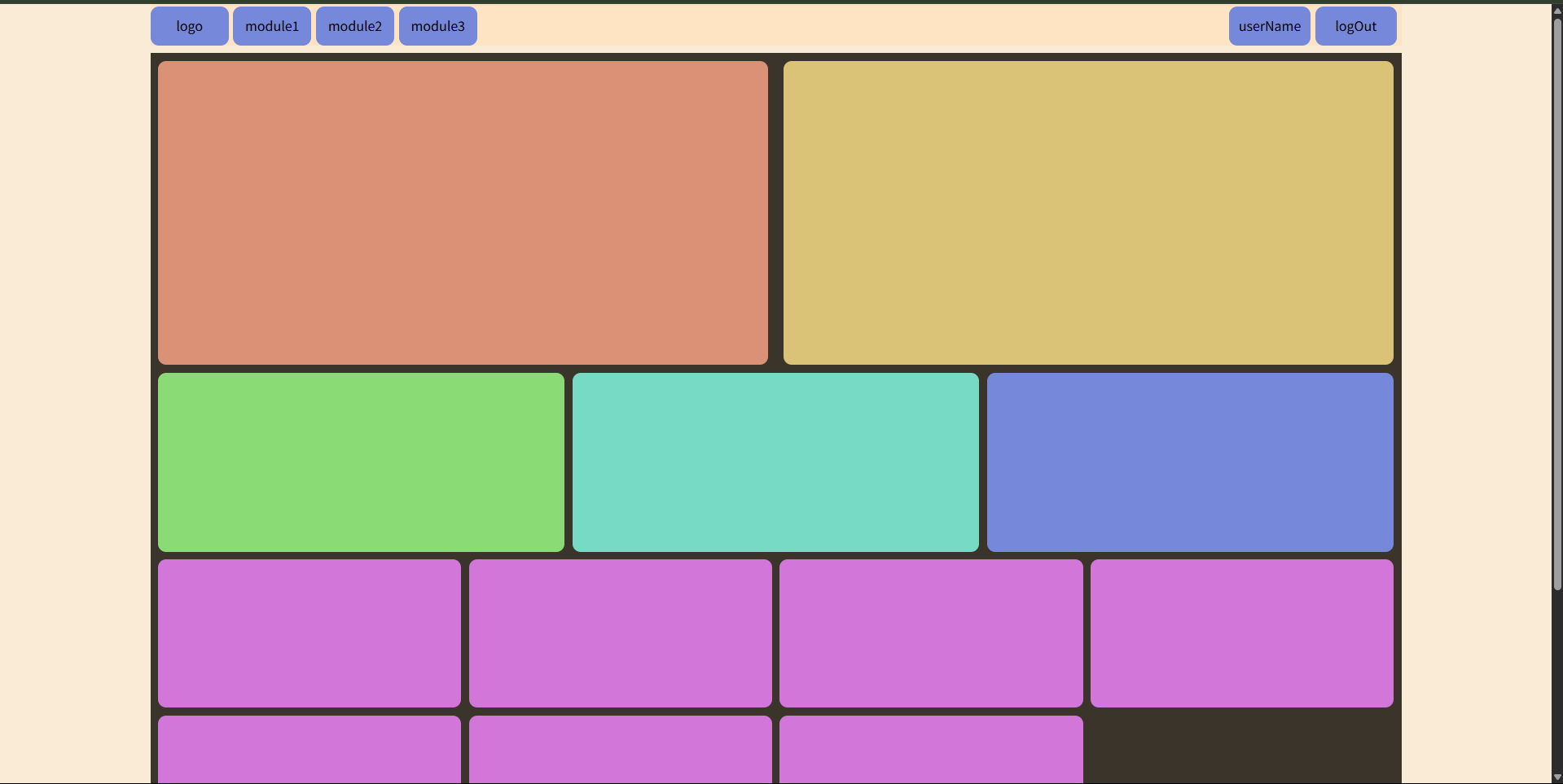 | <!DOCTYPE html> <html lang="en"> <head> <meta charset="UTF-8"> <meta name="viewport" content="width=device-width, initial-scale=1.0"> <title>CSS常见布局</title> <style> .body, * { padding: 0; margin: 0; } .clear { clear: both; } .clearfix::after { display: block; content: ""; height: 0; width: 0; overflow: hidden; clear: both; } .container { background-color: antiquewhite; } .container .header { width: 80vw; display: block; margin: 0 auto; background-color: bisque; } .container .header .left { width: 5vw; height: 5vh; line-height: 5vh; float: left; text-align: center; background-color: rgb(118, 136, 218); border-radius: 10px; margin: 0.3vh 0.3vw 0 0; } .container .header .left:hover { background-color: rgb(69, 81, 136); } .container .header .right { width: 100px; height: 5vh; line-height: 5vh; float: right; text-align: center; background-color: rgb(118, 136, 218); border-radius: 10px; margin: 0.3vh 0.3vw 0 0; } .container .header .right:hover { background-color: rgb(69, 81, 136); } .container .content { width: 80vw; background-color: rgb(59, 52, 42); margin: 0 auto; } .container .content .row1 { margin-bottom: 1vh; margin-top: 1vh; } .container .content .row1 .column1_1 { width: 39vw; height: 39vh; border-radius: 10px; background-color: rgb(218, 145, 118); float: left; margin-left: 0.5vw; margin-top: 1vh; } .container .content .row1 .column1_2 { width: 39vw; height: 39vh; border-radius: 10px; background-color: rgb(218, 195, 118); float: right; margin-right: 0.5vw; margin-top: 1vh; } .container .content .row2 { margin-bottom: 1vh; } .container .content .row2 div { width: 26vw; height: 23vh; border-radius: 10px; margin-left: 0.5vw; float: left; } .container .content .row2 .column2_1 { background-color: rgb(138, 218, 118); } .container .content .row2 .column2_2 { background-color: rgb(118, 218, 196); } .container .content .row2 .column2_3 { background-color: rgb(118, 136, 218); } .container .content .row3 { margin-top: 1vh; } .container .content .row3 div { width: 19.38vw; height: 19vh; border-radius: 10px; background-color: rgb(210, 118, 218); margin-left: 0.5vw; margin-bottom: 1vh; float: left; } .container .foot { width: 80vw; height: 20vh; background-color: blueviolet; margin: 0 auto; } </style> </head> <body> <div class="container"> <div class="header clearfix"> <div class="left indexLogo">logo</div> <div class="left">module1</div> <div class="left">module2</div> <div class="left">module3</div> <div class="right">logOut</div> <div class="right">userName</div> </div> <div class="content"> <div class="row1"> <div class="column1_1"></div> <div class="column1_2"></div> <div class="clear"></div> </div> <div class="row2 clearfix"> <div class="column2_1"></div> <div class="column2_2"></div> <div class="column2_3"></div> </div> <div class="row3 clearfix"> <div class="column3_n"></div> <div class="column3_n"></div> <div class="column3_n"></div> <div class="column3_n"></div> <div class="column3_n"></div> <div class="column3_n"></div> <div class="column3_n"></div> </div> </div> <div class="foot"></div> </div> </body> </html>