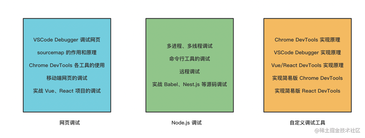 课程主要分为四部分内容:用 VSCode Debugger 调试网页的 JS、用 VSCode Debugger 调试 Node.js、用 Chrome DevTools 调试网页、调试工具的原理和实现简易版调试工具。
