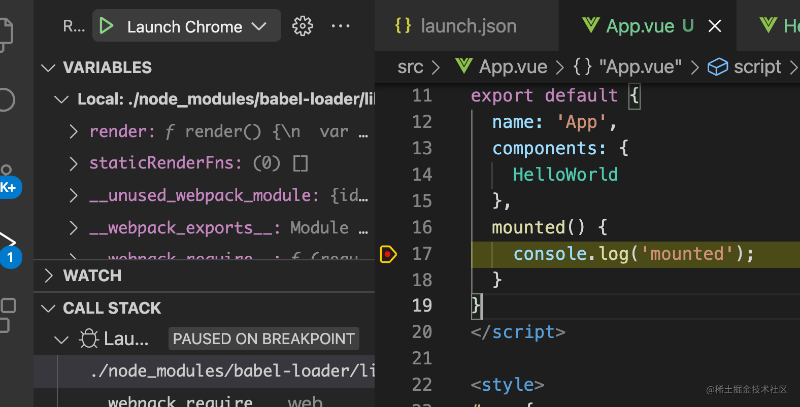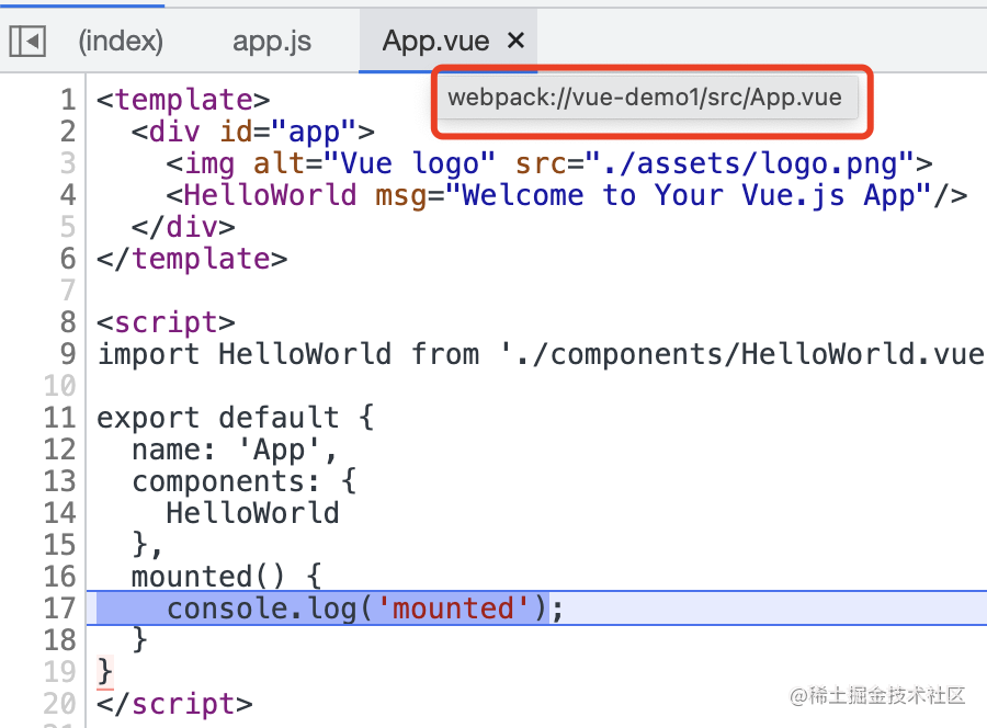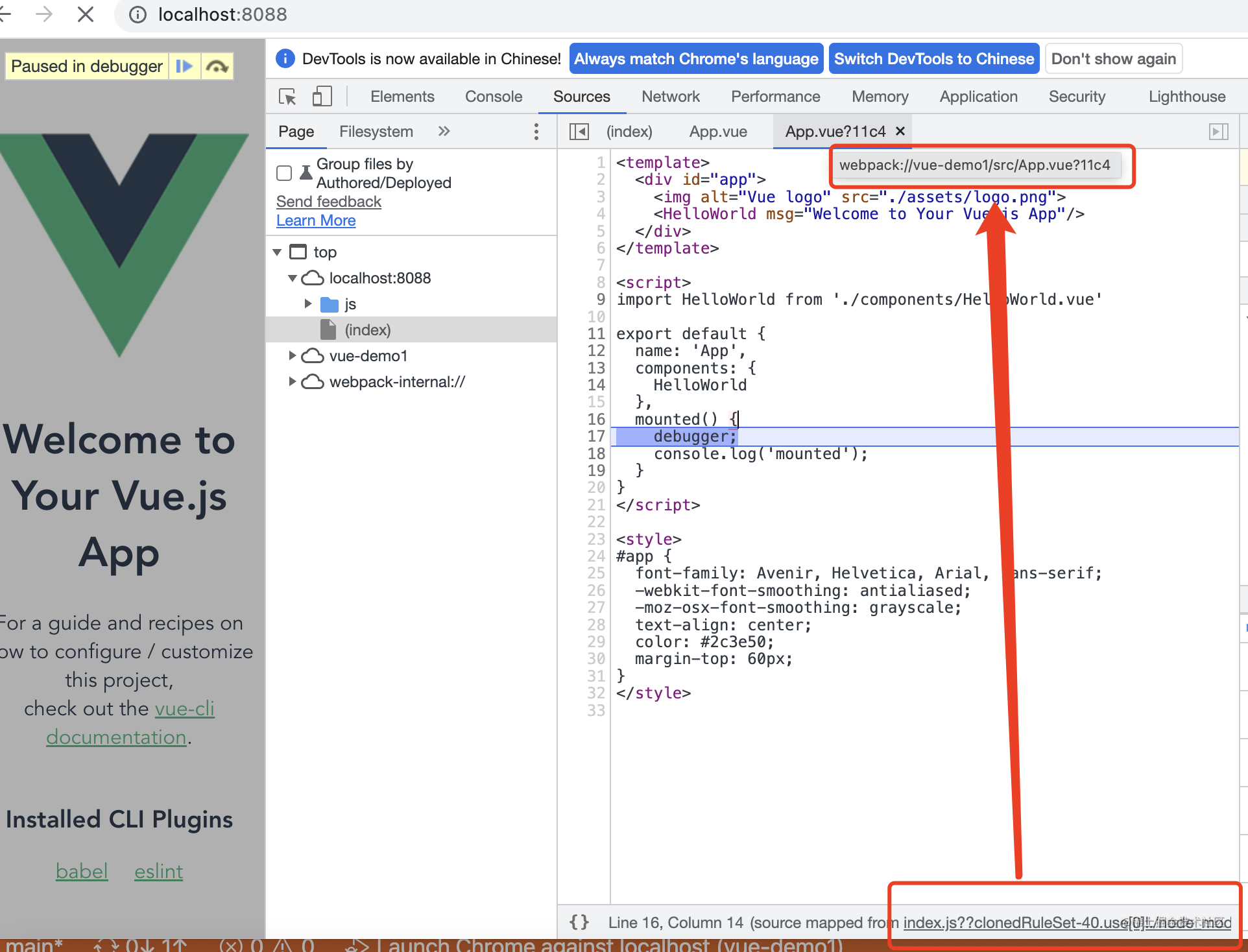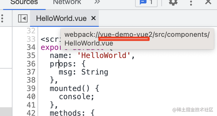 你会发现他从一个乱七八糟的路径,映射到了 webpack://vue-demo1/src/App.vue?11c4 的路径下。