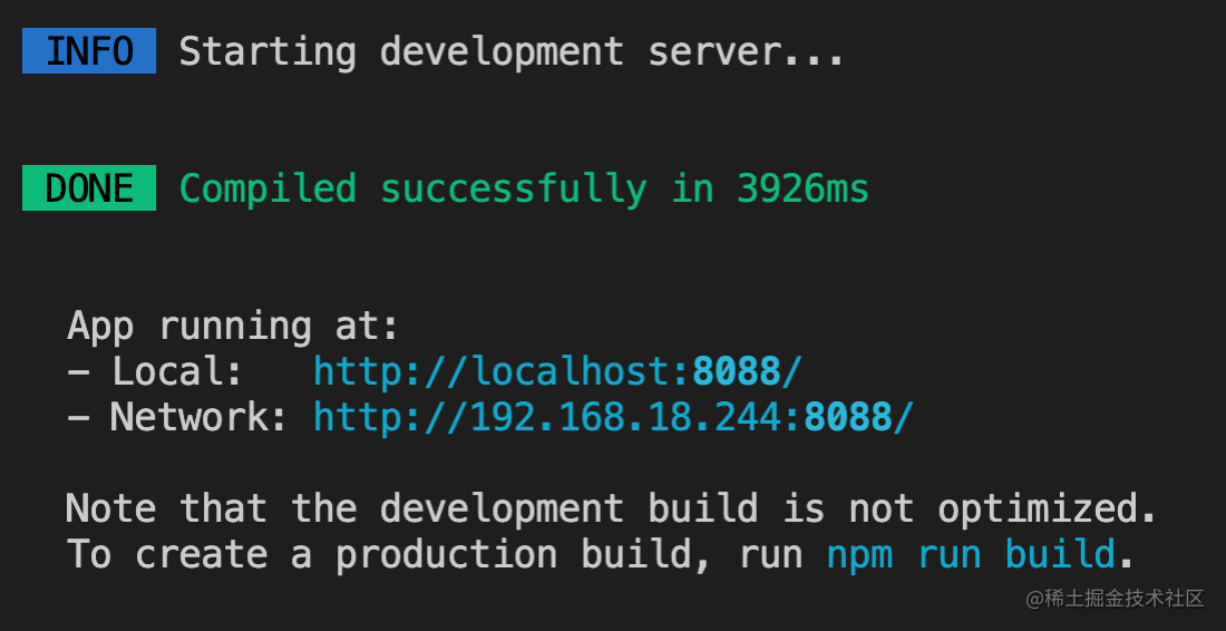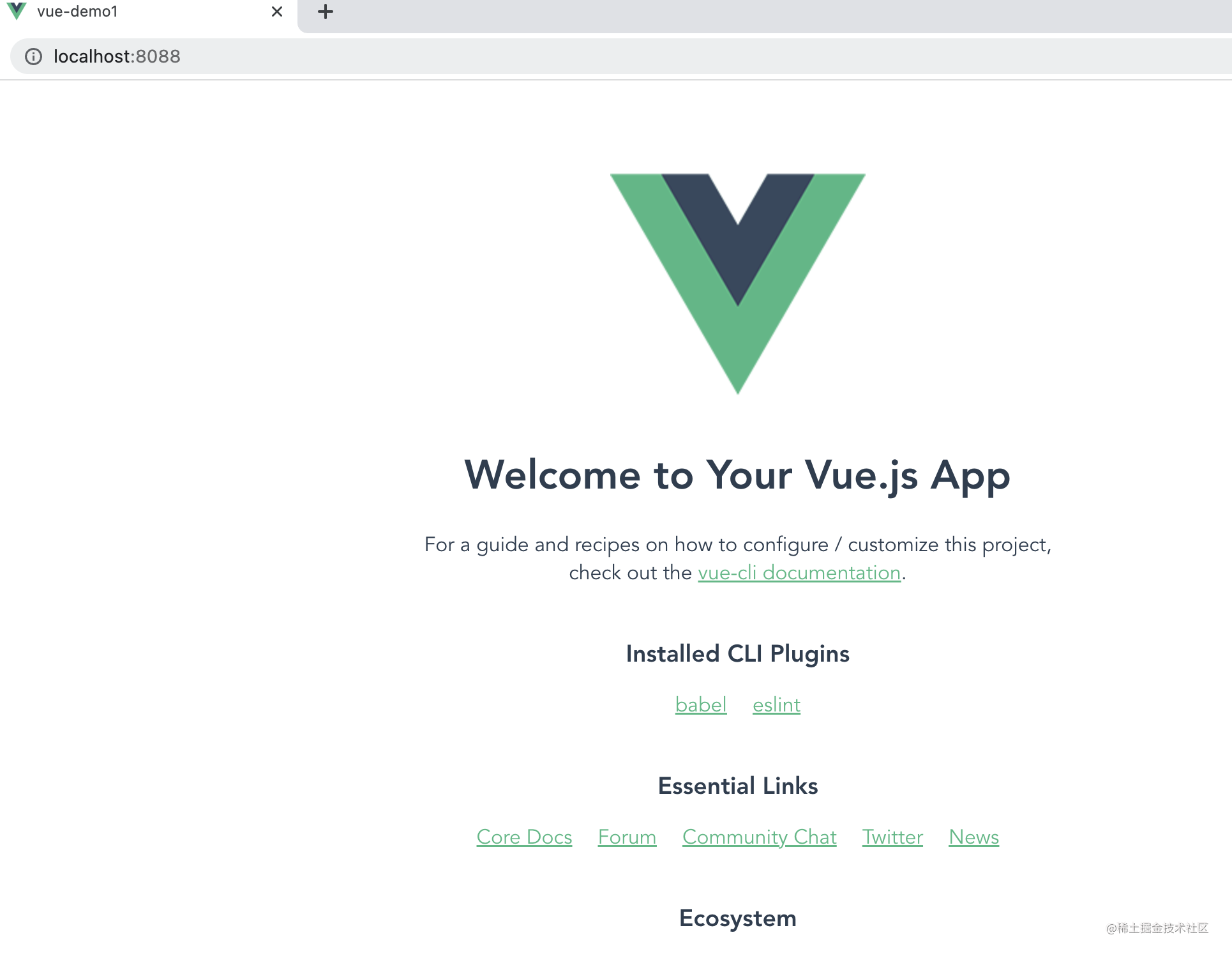 安装完之后进入到 vue-demo1 目录,执行 npm run serve 把开发服务跑起来。