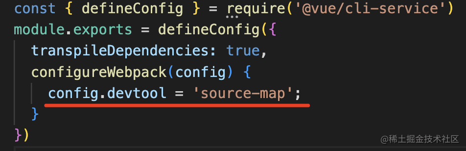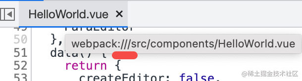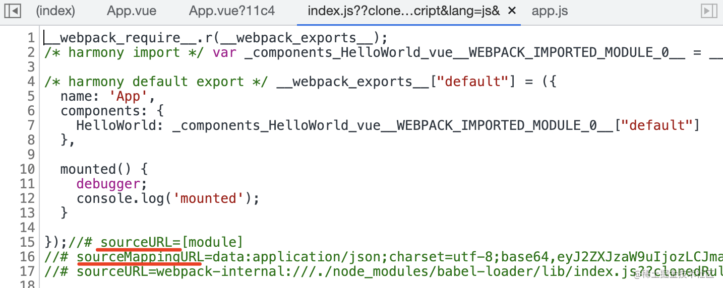 这是因为 vue cli 默认的 devtool 设置是 eval-cheap-module-source-map,前面讲过,eval 是每个模块用 eval 包裹,并且通过 sourceURL 指定文件路径,通过 sourceMappingURL 指定 sourcemap。