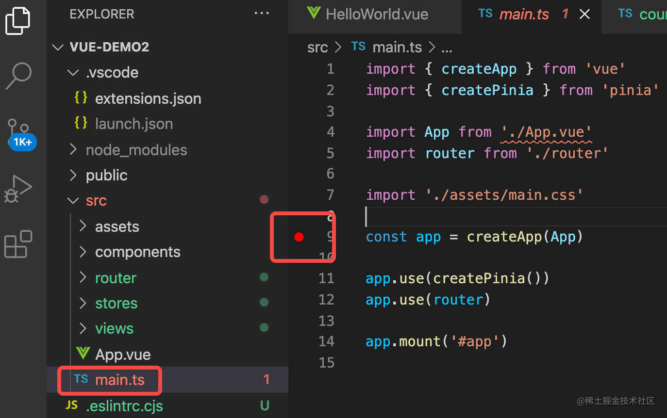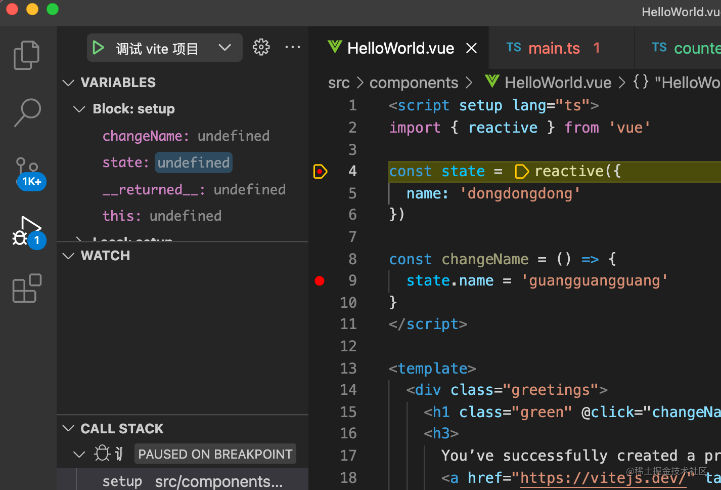 修改下 HelloWorld.vue 的代码,然后打两个断点: