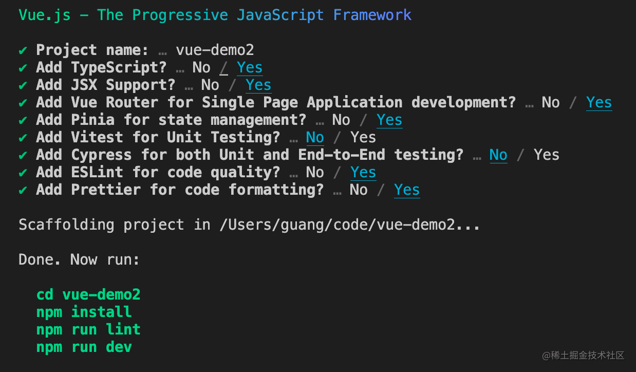 然后执行 vue create vue-demo1 创建 vue 项目: