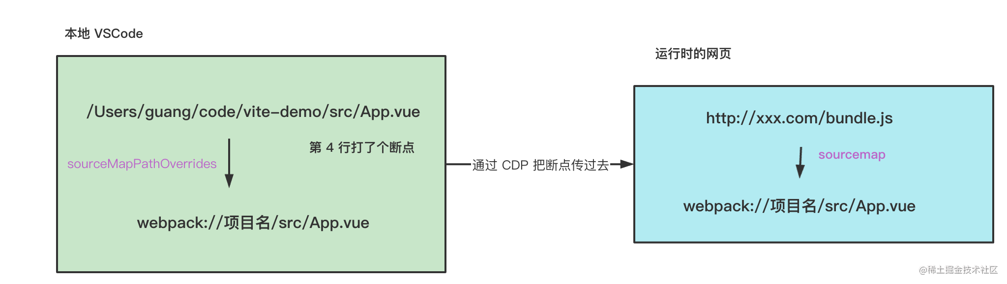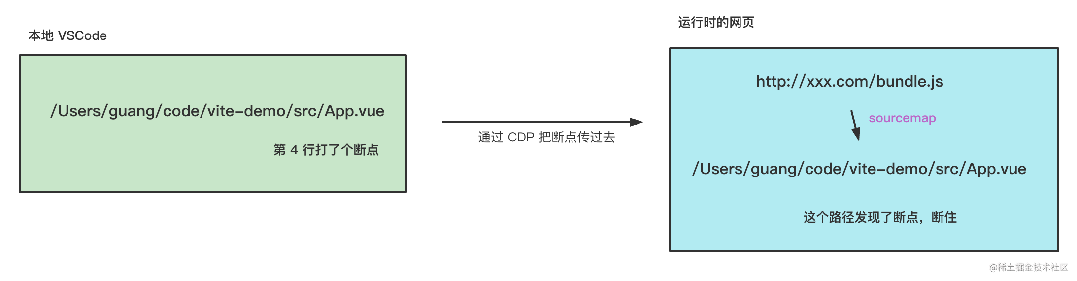 我们打的断点最终还是在代码的运行时,也就是网页里断住的,所以在 VSCode 里打的断点会被传递给浏览器,通过 CDP 调试协议。