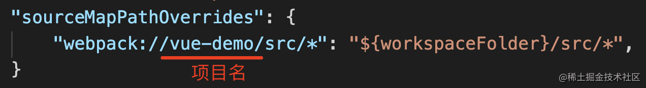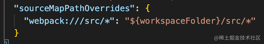 这是默认生成的三个配置,最后一个就是映射 webpack 路径的,其实是把以 ${workspaceFolder} 开头的本地路径映射成了 webpack:// 开头的路径传给浏览器。