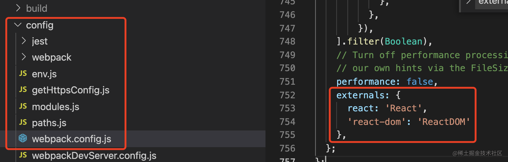 然后把 react 和 react-dom 配置到 webpack 的 externals 里,不进行打包,而是单独在 index.html 里引入。