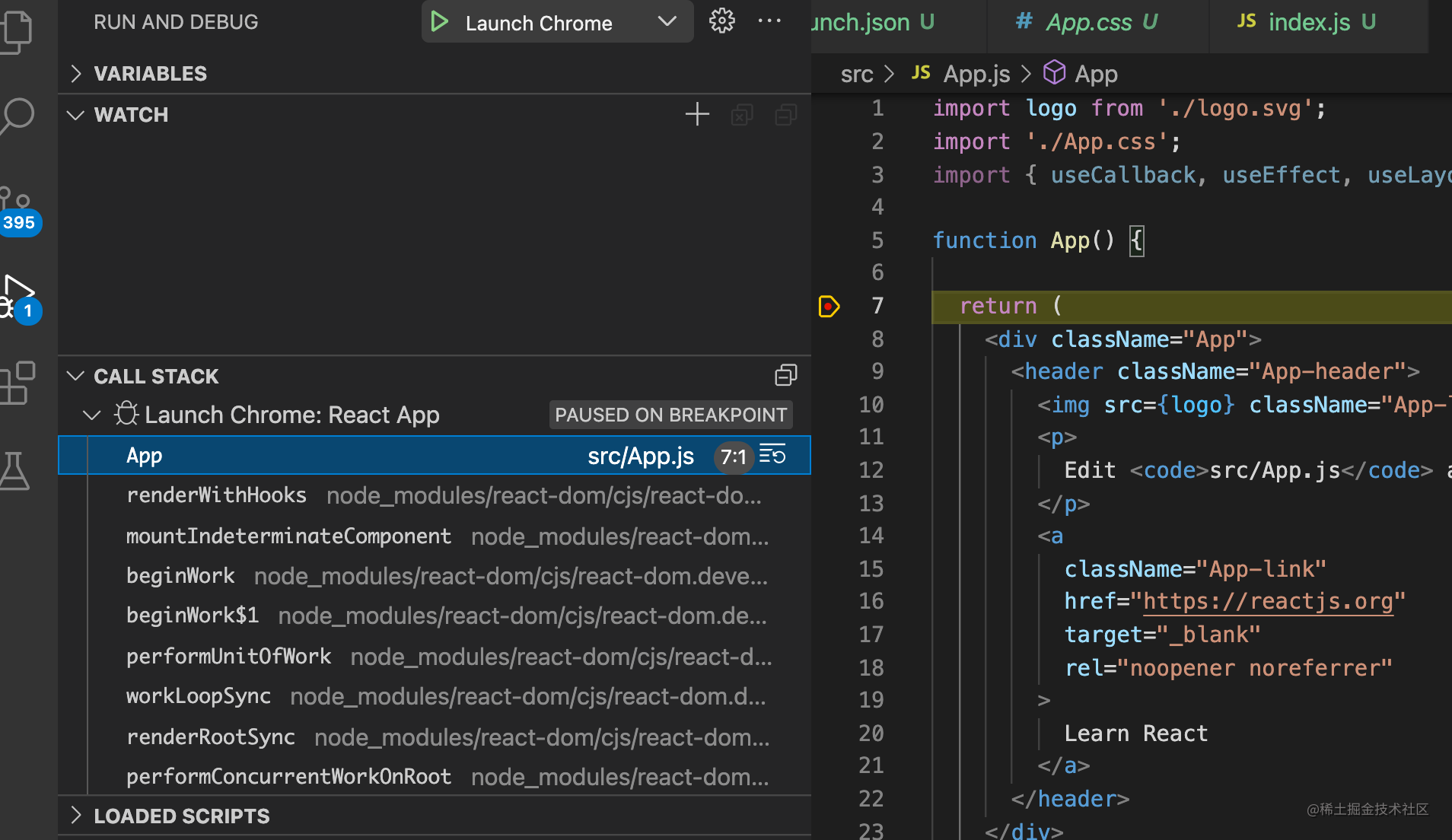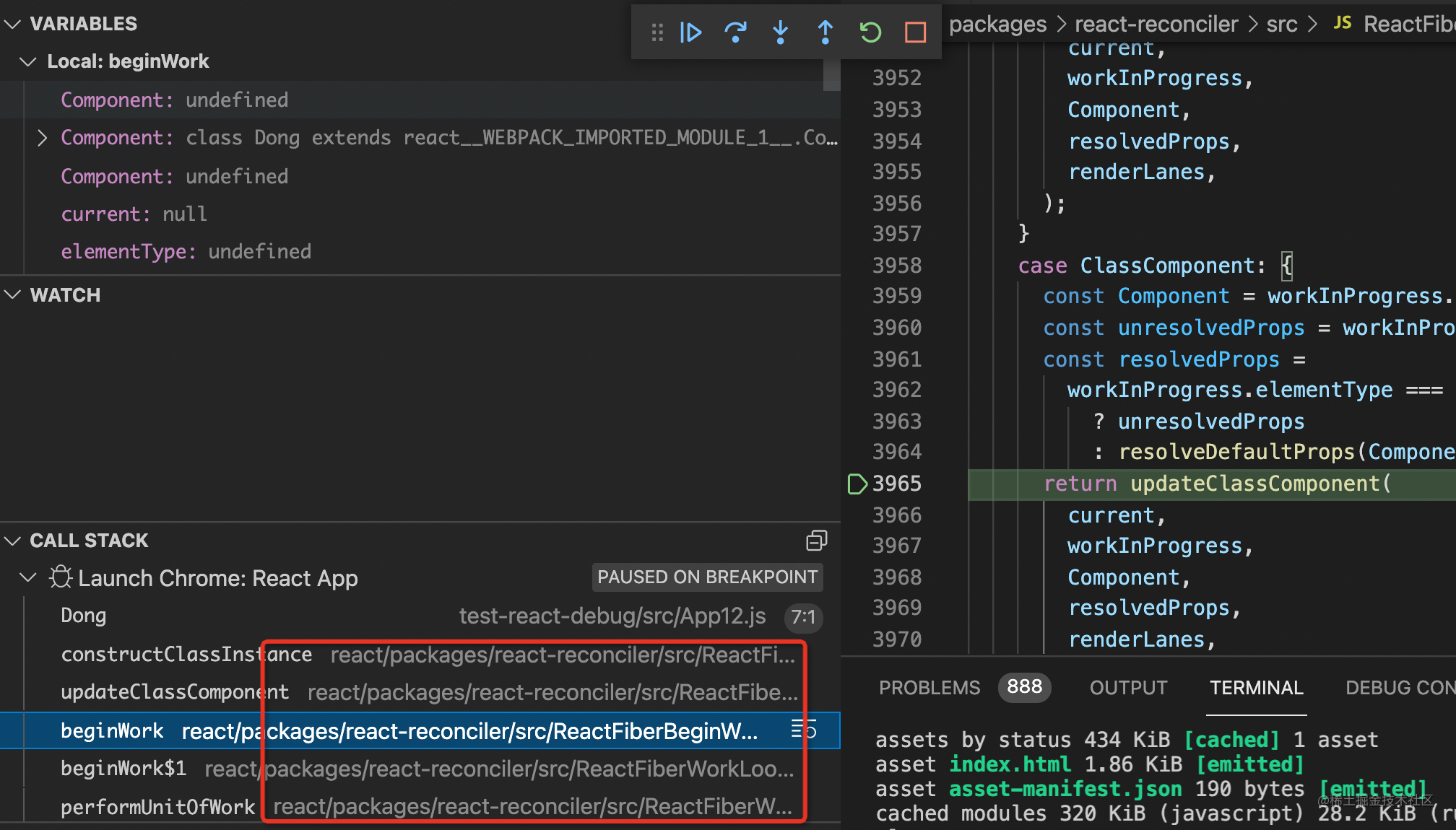 更重要的是,现在就可以直接在 react 的 src 下打断点了,代码执行到那里就会断住,这是把 react 源码也放到 workspace 下的最大的好处。