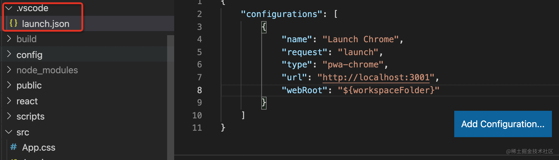 但我们的目标是在 VSCode 里调试,所以要添加一个 VSCode 的 debugger 配置: