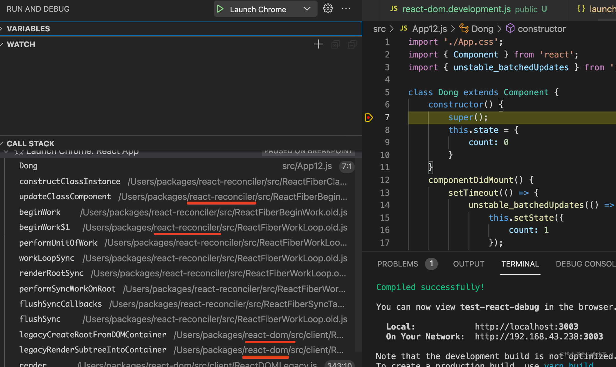 用 VSCode 调试比 Chrome DevTools 方便一些,但现在调试的依然是 react-dom.development.js: