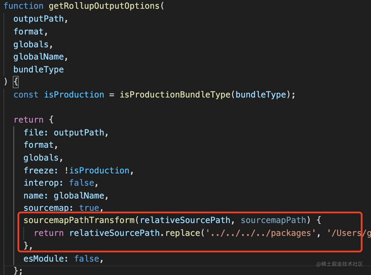 所以再去修改下 react build 流程,在 ./script/rollup/build.js 下,添加一个 sourcemap 的路径映射,把 ../../../packages 映射到 react 项目的绝对路径/packages :