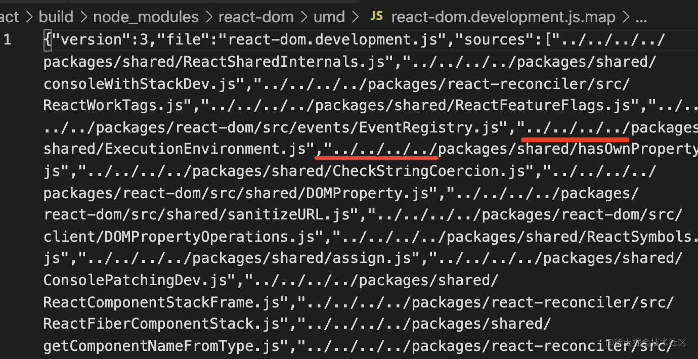 因为我们虽然 build React 源码生成了 sourcemap,但是 webpack 打包的时候没有关联它啊,这样 webpack 的 sourcemap 就只能映射到 react-dom.development.js 不能进一步映射到源码了。