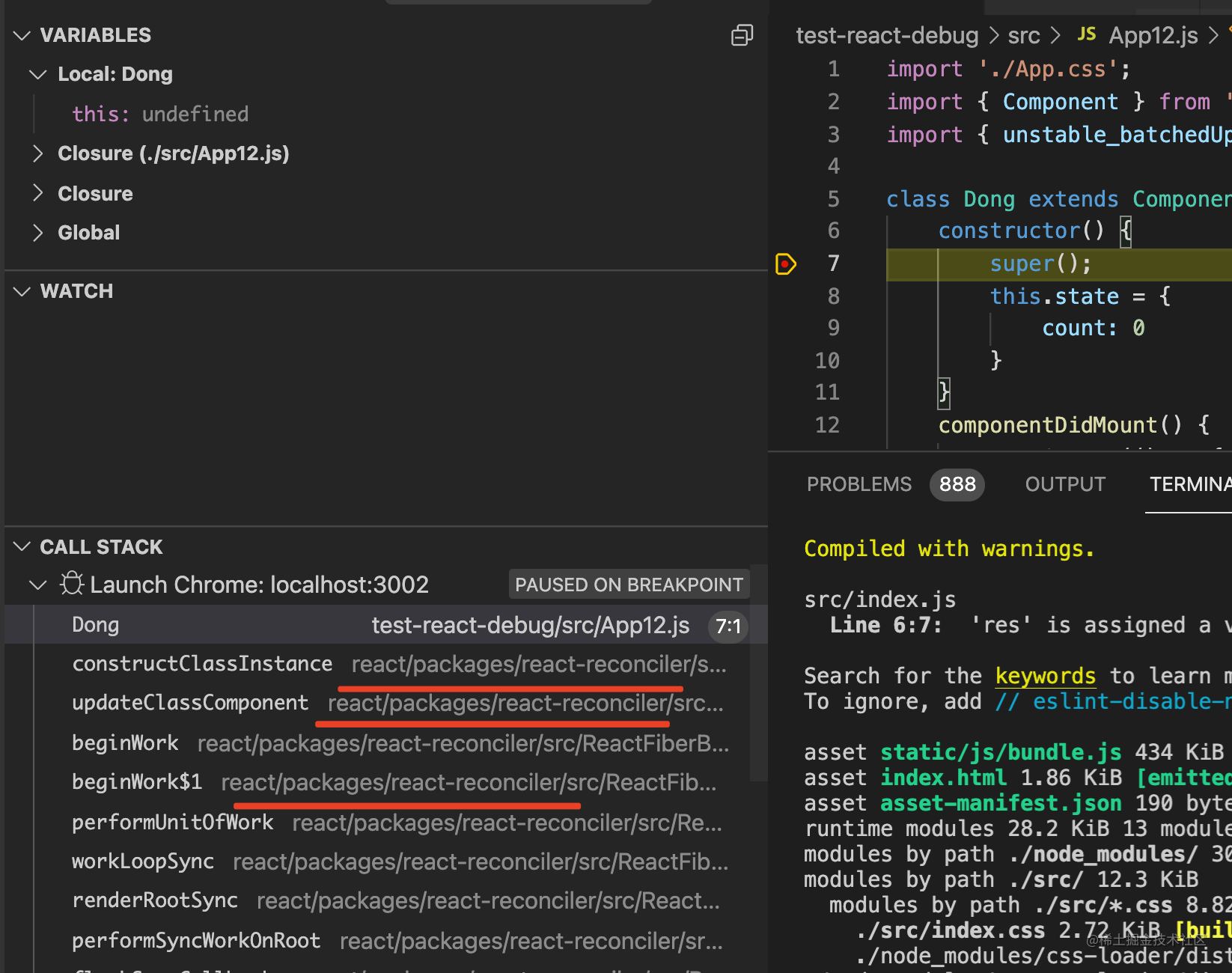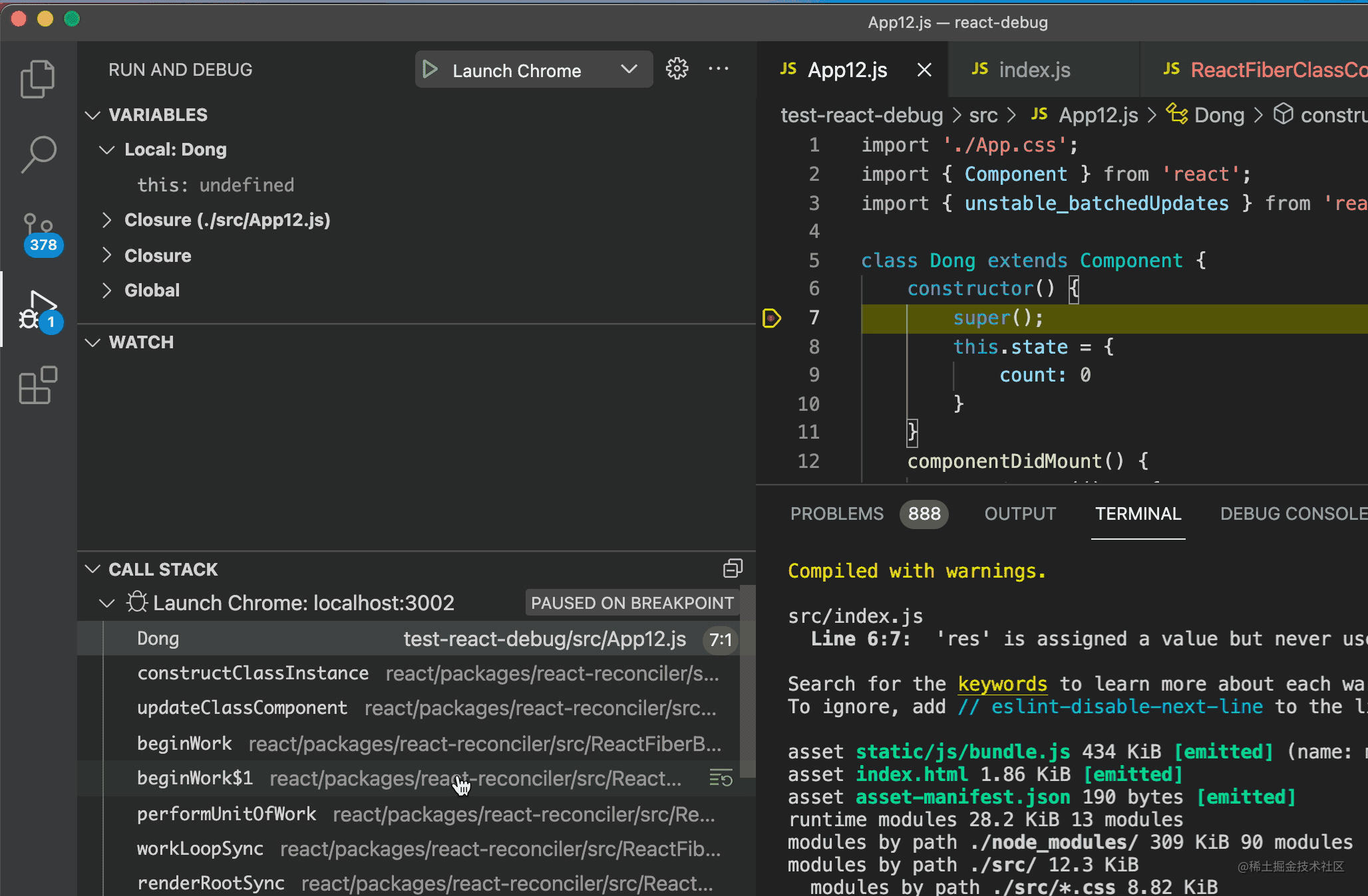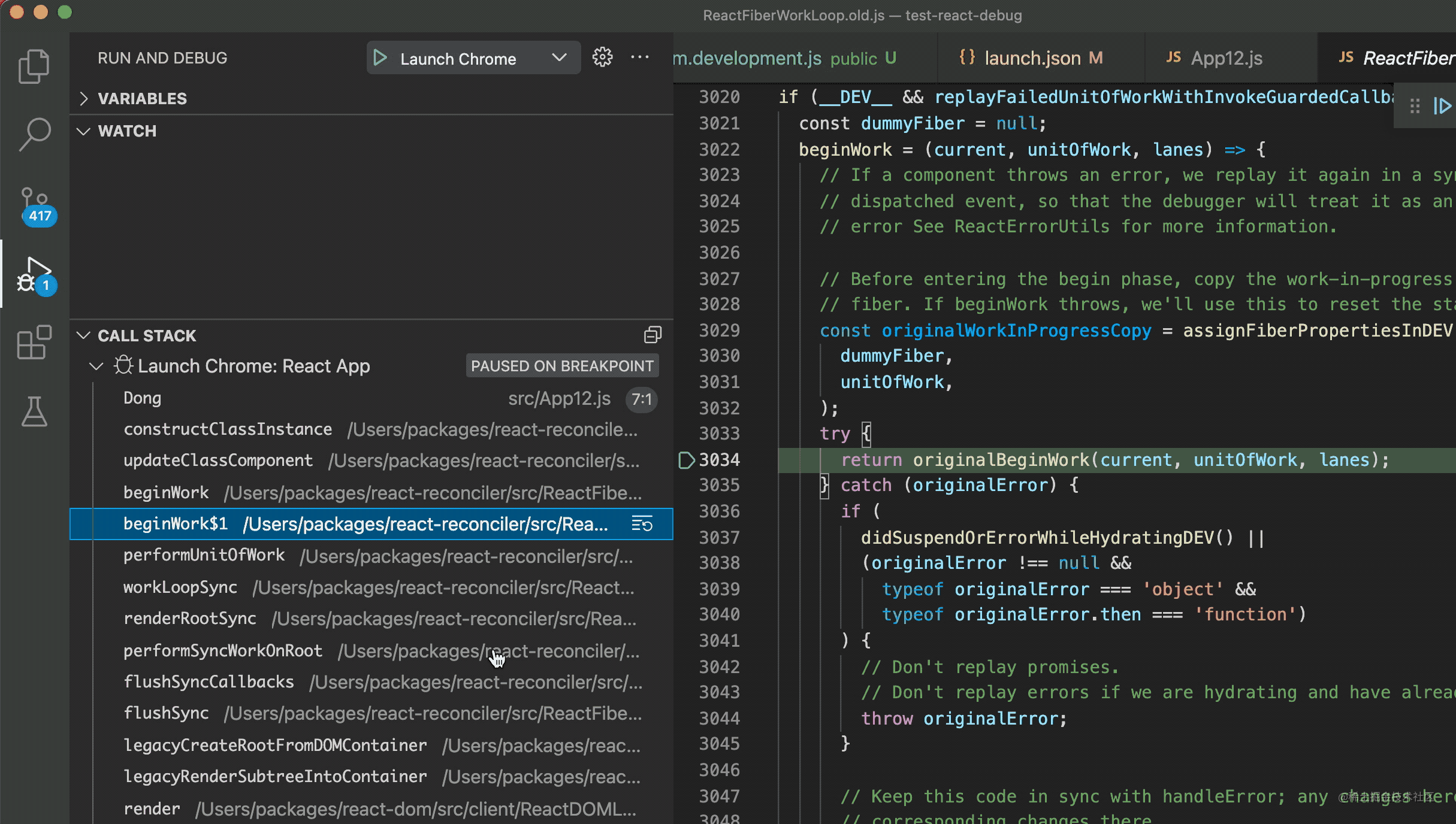 如果想点击调用栈直接打开对应 React 源码项目的文件,那就新建一个 workspace,把测试项目和 React 源码项目包含就行了。因为 VSCode 如果在 workspace 下找到了 source map 到的文件,就会直接打开对应的文件。这样就可以直接在源码打断点了。