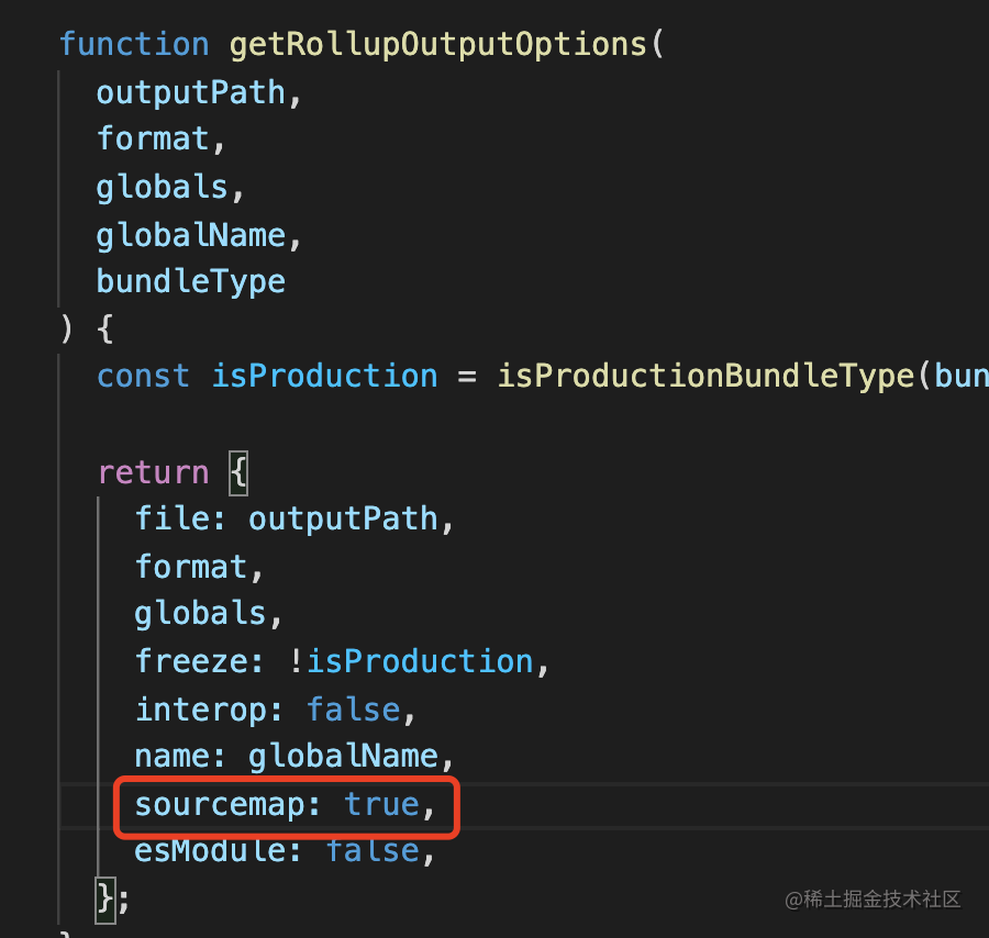 找到 rollup 的配置,添加一行 sourcemap: true,这个很容易理解,就是让 rollup 在构建时产生 sourcemap: