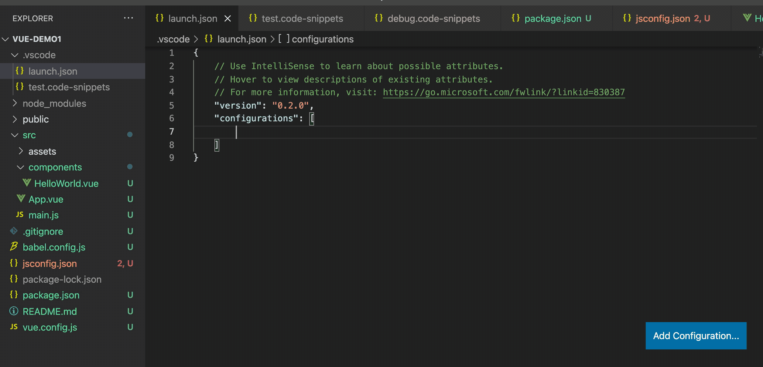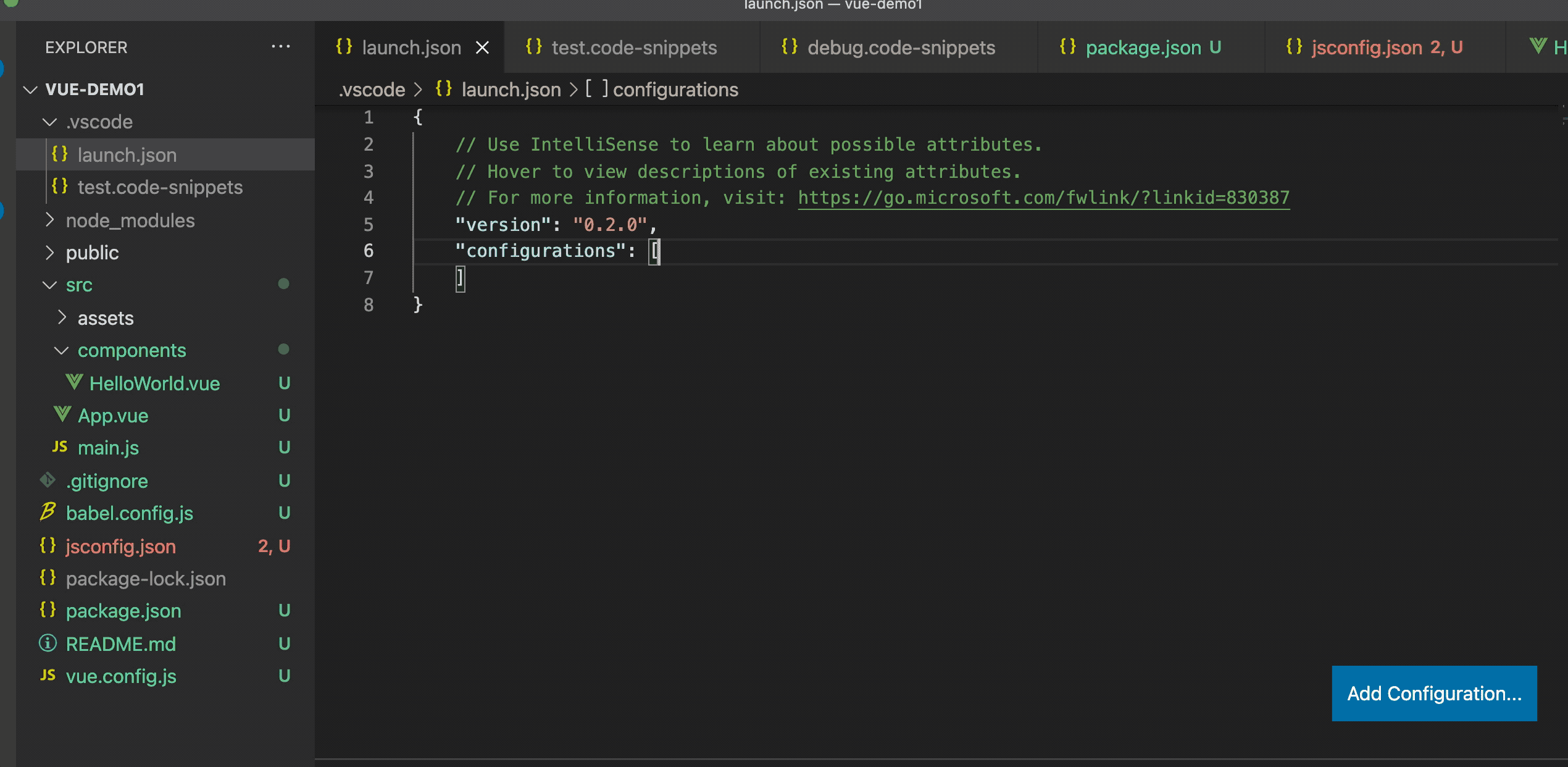 把这段创建调试配置的 snippets 放到全局 snippets,那样就每个项目都能用了。