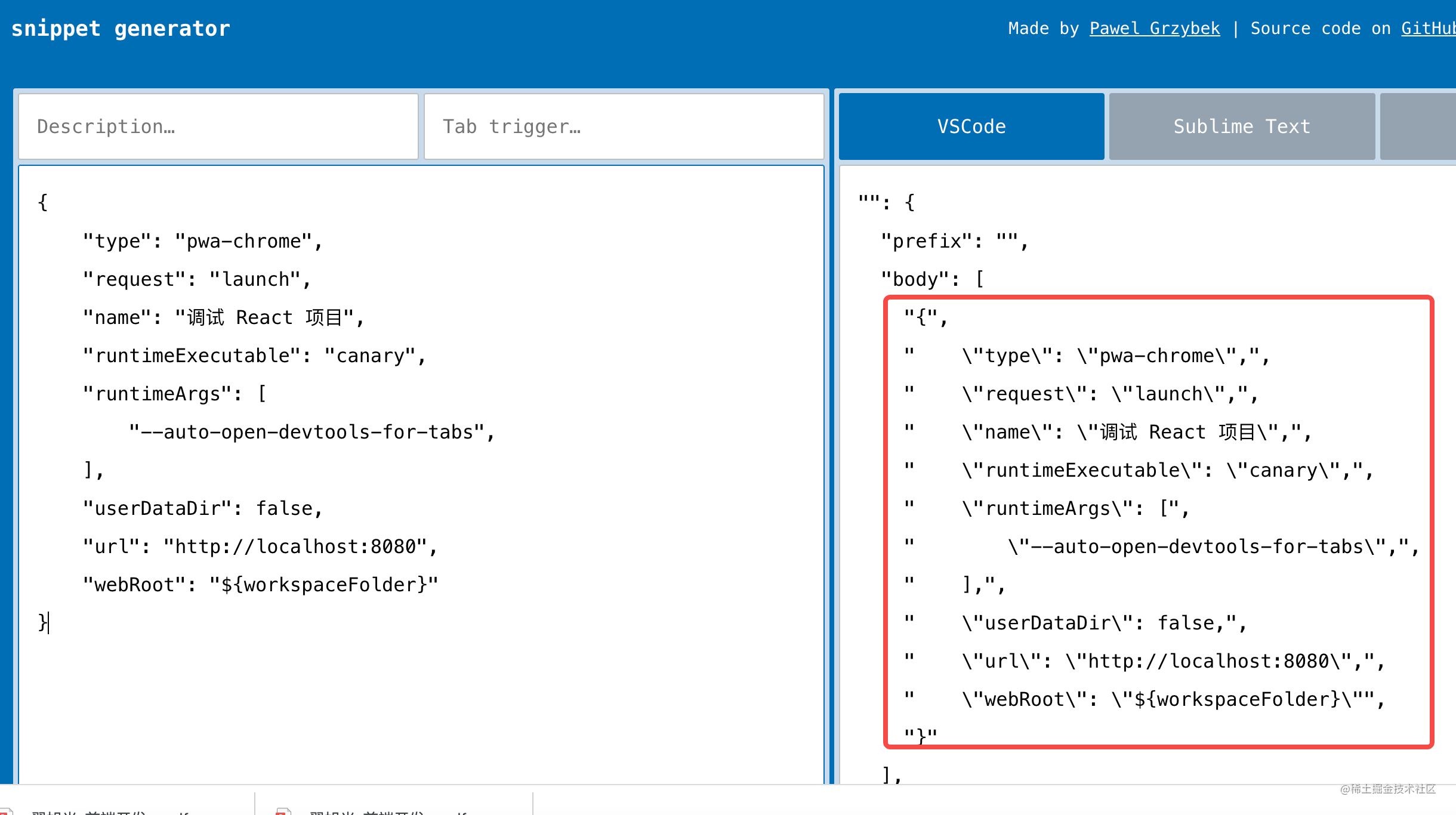 不过有工具网站 snippet-generator.app 来做这件事情,只需要把内容贴在左边,那么在右边就会展示变为 snippets 之后的配置。
