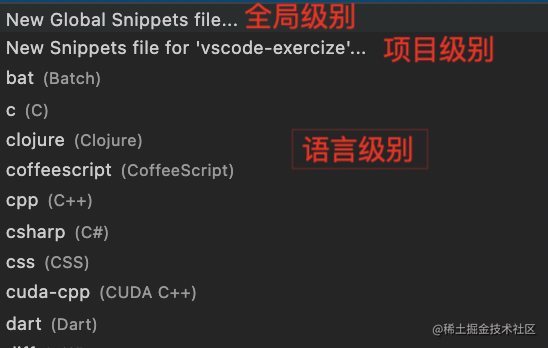 全局级别是全局生效的,项目级别只在当前项目生效,语言级别是某种语言的文件里生效。
