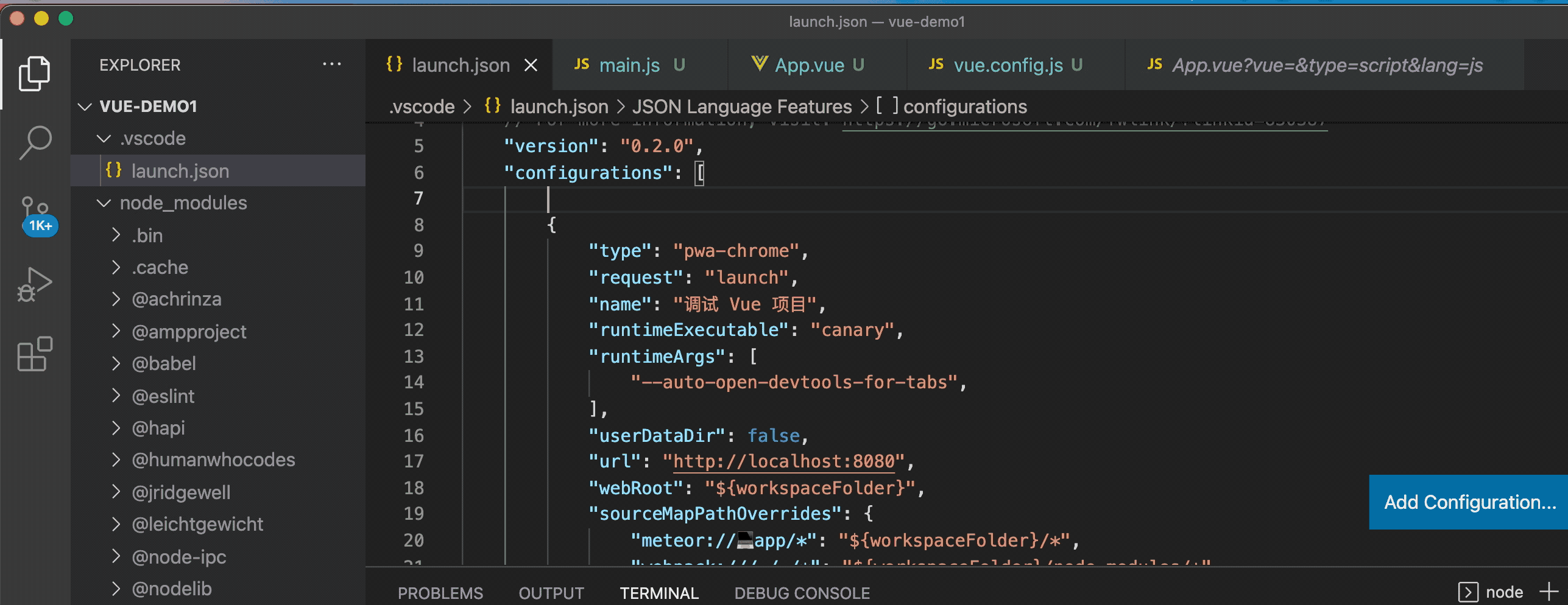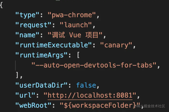 比如调试 Vue 项目时,默认生成的调试配置是这样的: