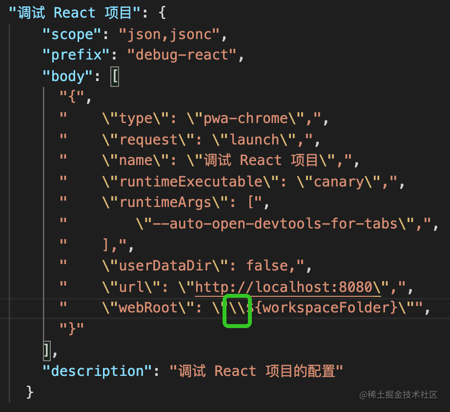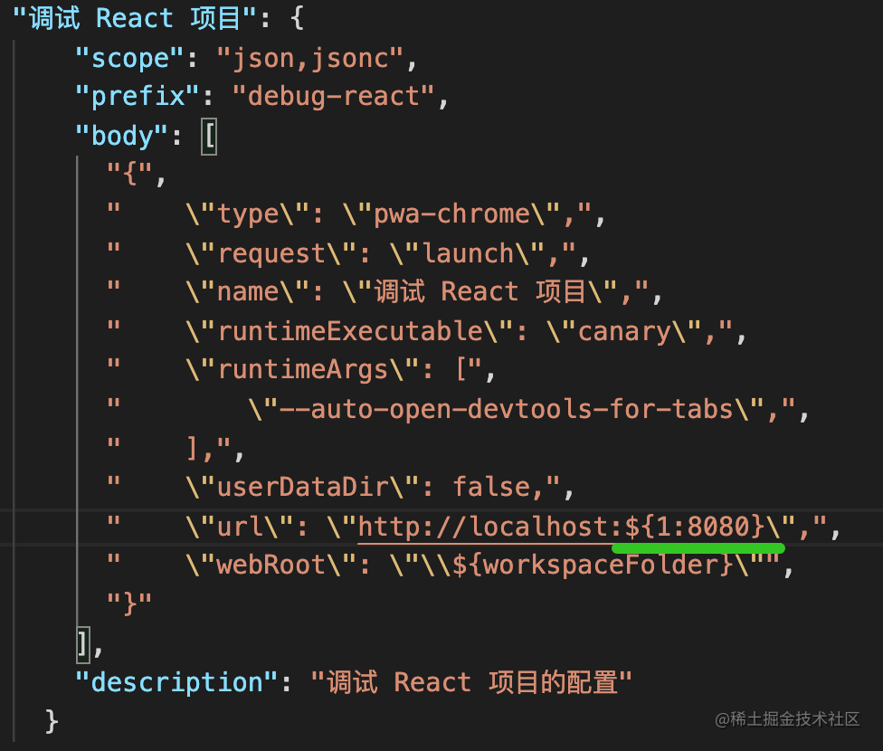 比如 React、Vue 的调试配置就可以封装成 Snippets: