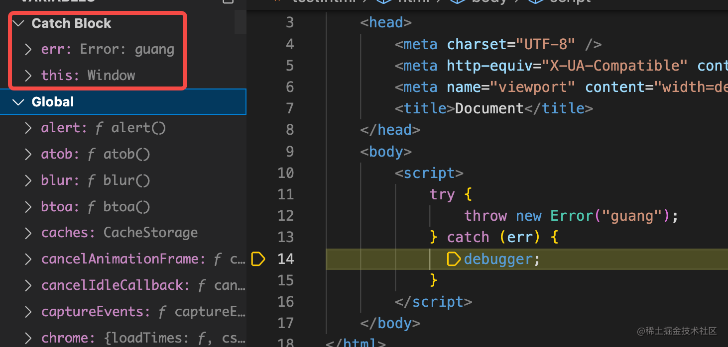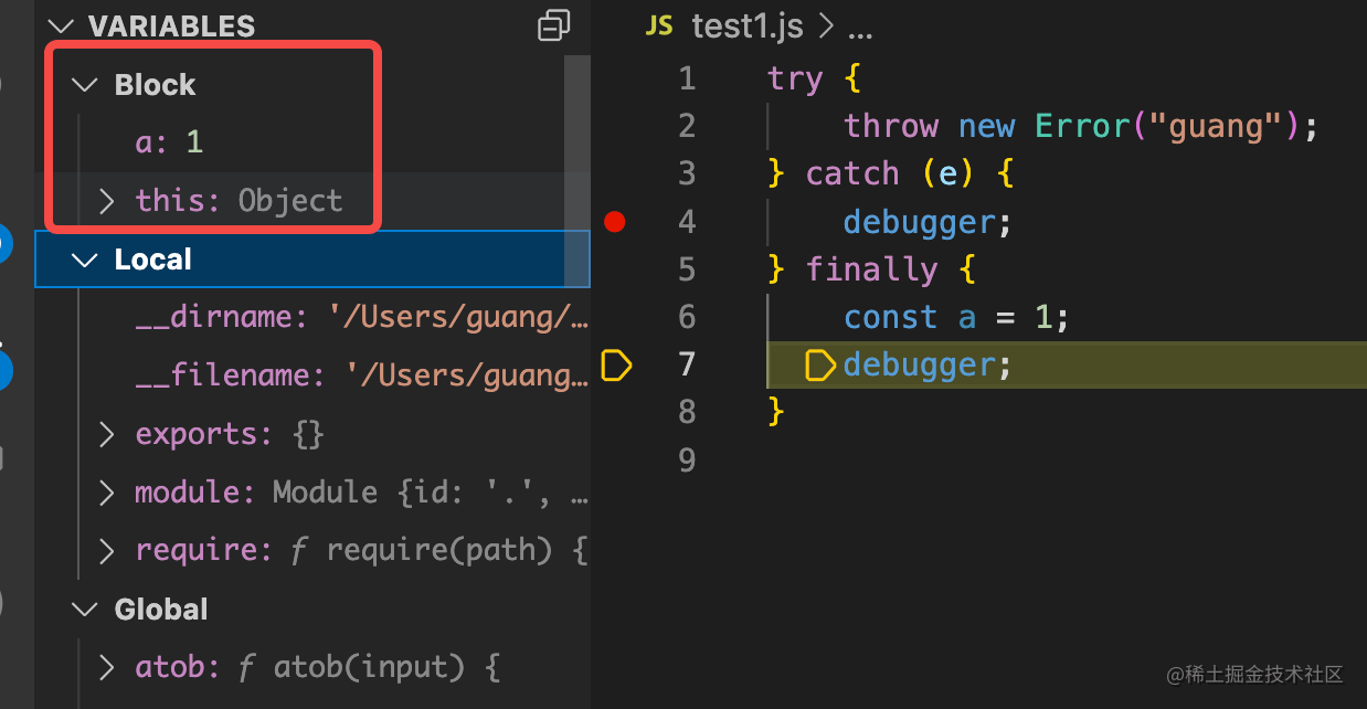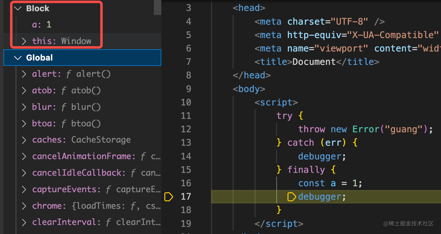 Catch 语句也会生成一个特殊的作用域,Catch Block 作用域,特点是能访问错误对象: