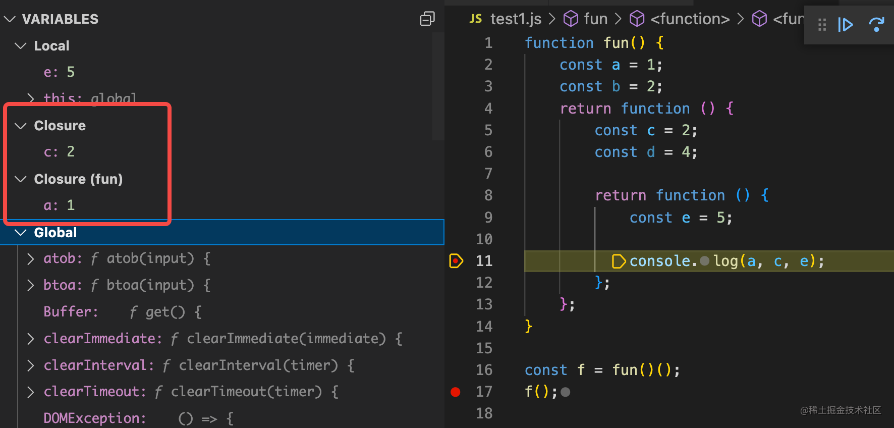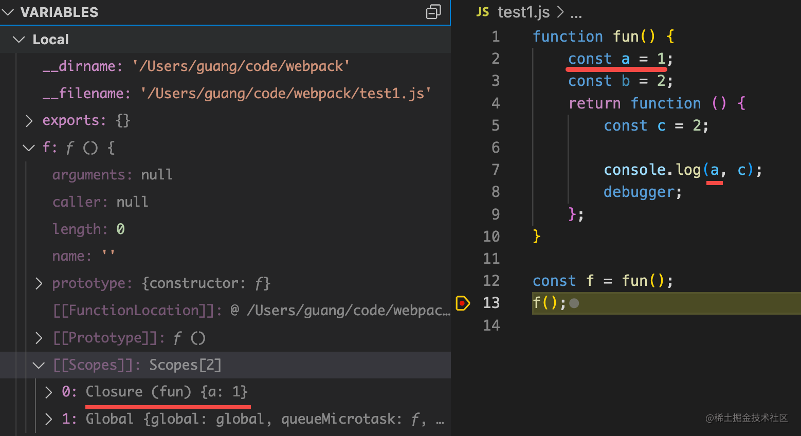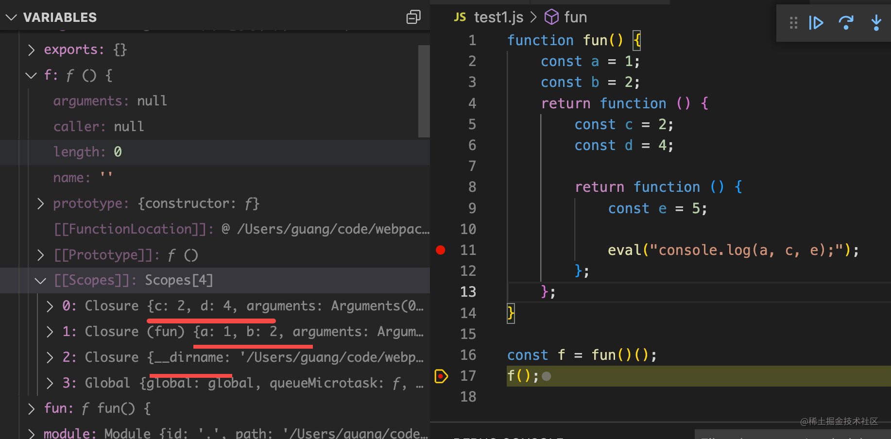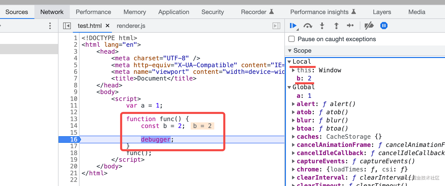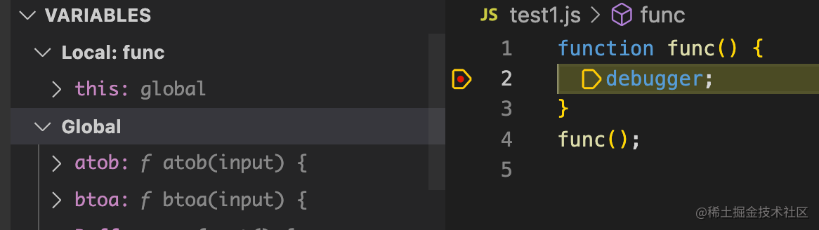 声明个函数,在函数内声明一个变量,调用这个函数的时候,可以看到 Scope 里有 Local 类型的作用域,也就是本地作用域,里面保存了变量 b: