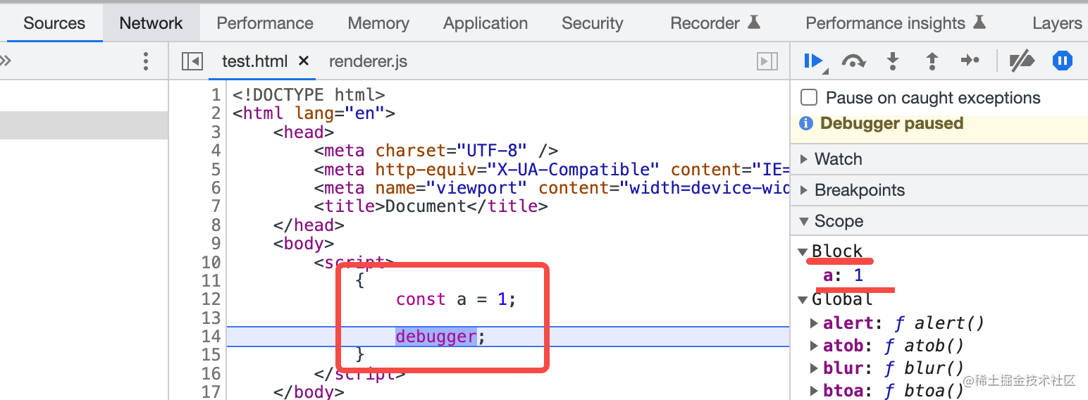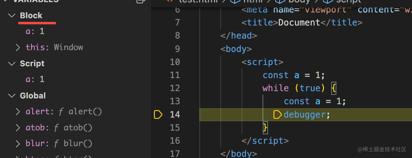 如图,会把里面声明的变量 a 放到 Block 作用域内,也就是块级作用域。