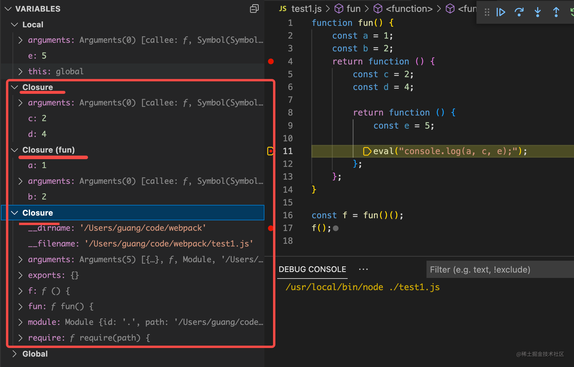 - Closure 作用域:函数返回函数的时候,会把用到的外部变量保存在 Closure 作用域里,这样再执行的时候该有的变量都有,这就是闭包。eval 的闭包比较特殊,会把所有变量都保存到 Closure 作用域