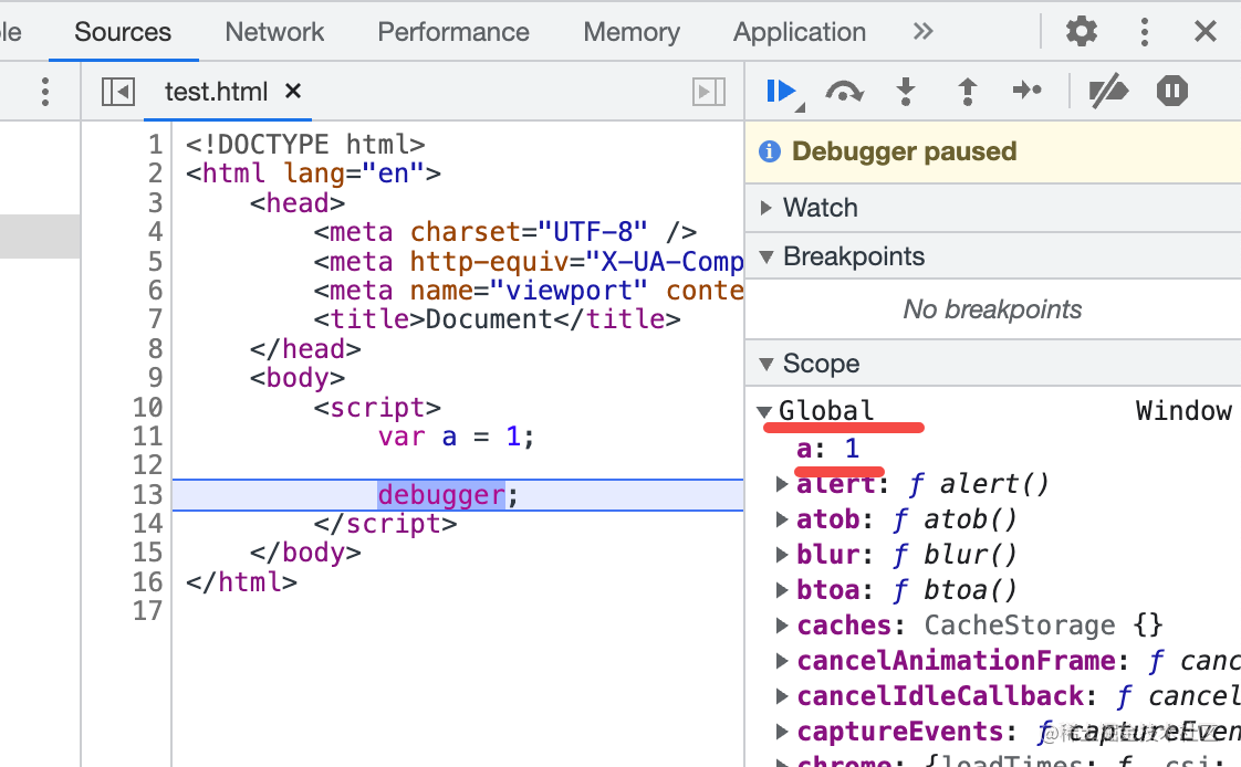 通过 var 声明一个变量,打个断点,可以看到 Scope 里有 Global 类型的作用域,也就是全局作用域,里面保存了变量 a: