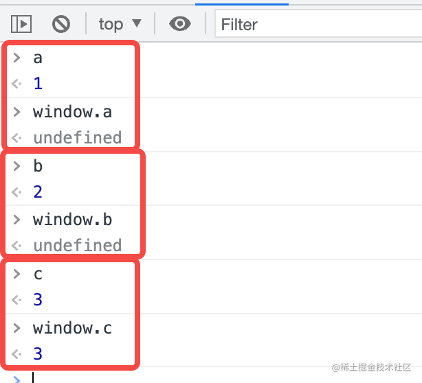 a、b、c 如果都是全局变量,那在浏览器里就可以通过 window.xx 来访问,但结果 window.a 和 window.b 都是 undefined,而直接访问 a、b 能拿到值。