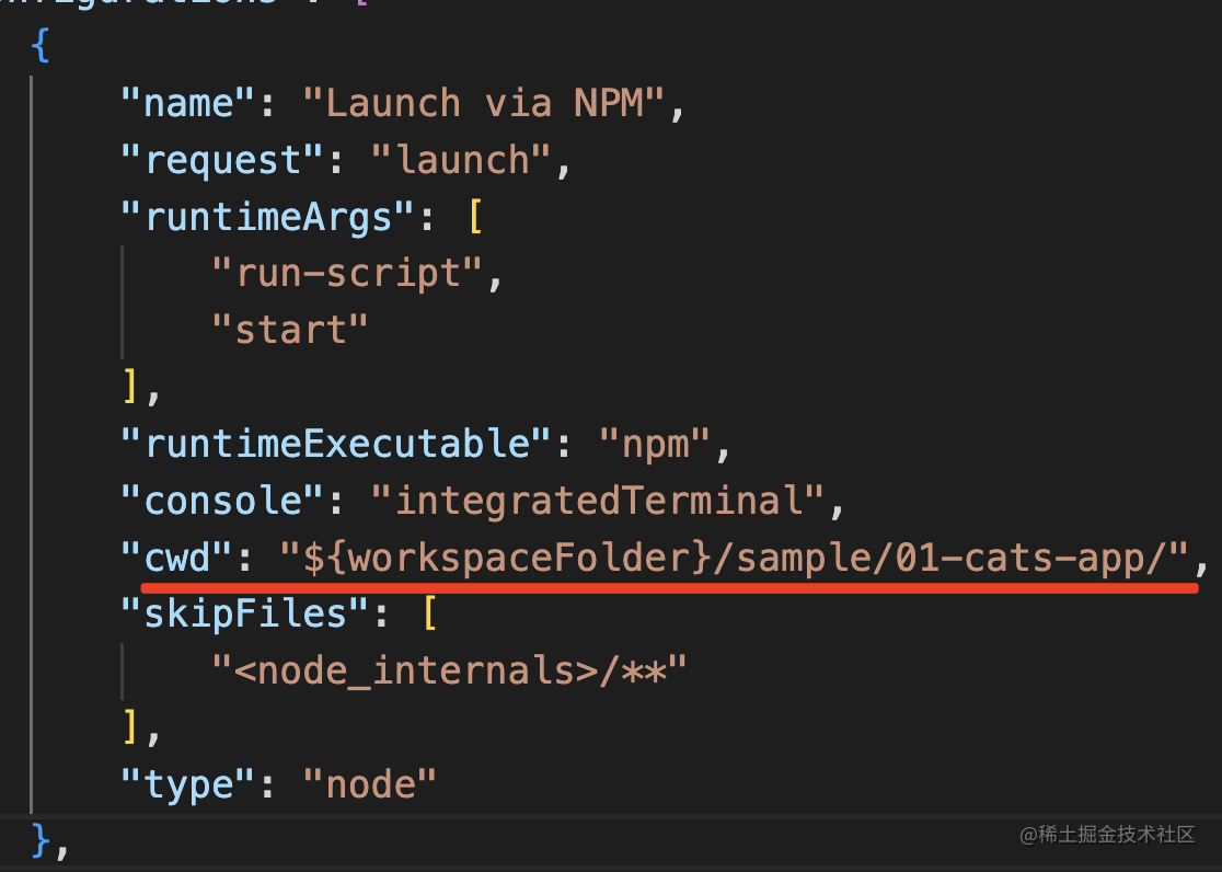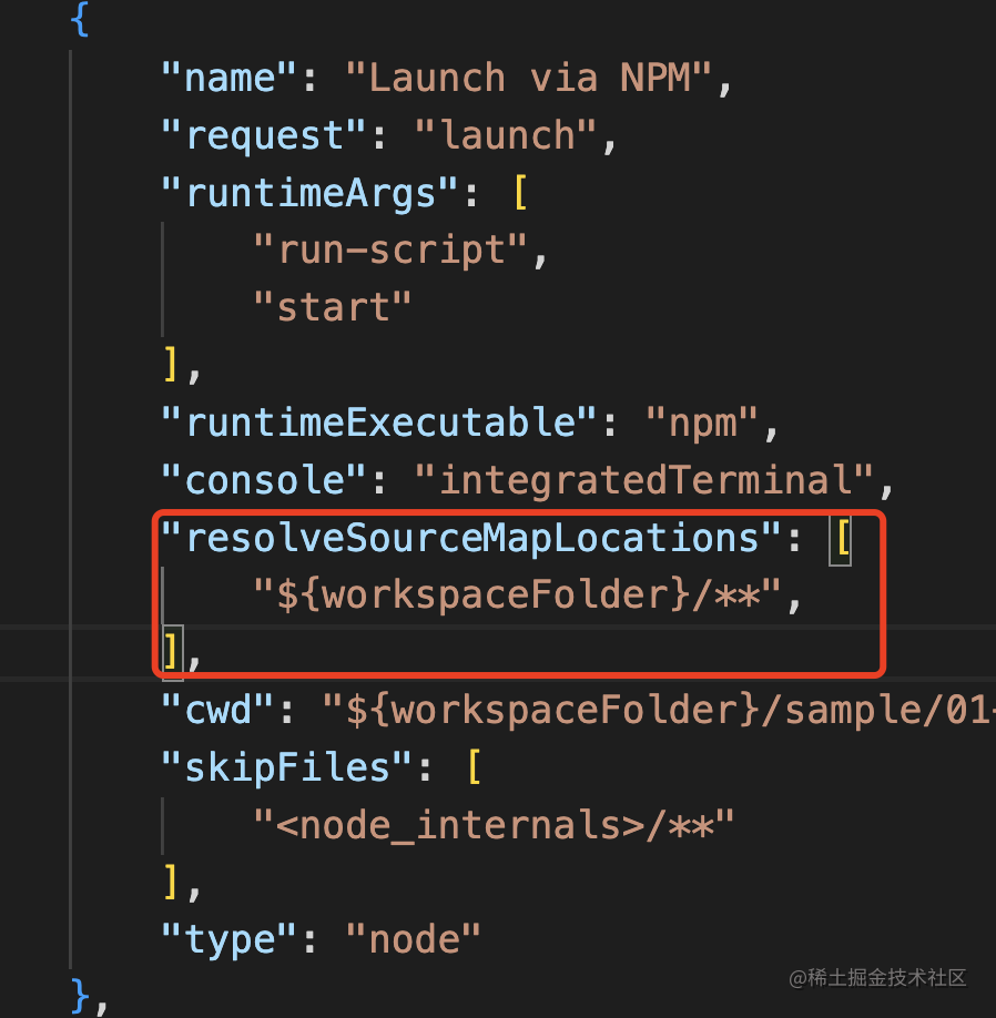 这里 console 要设置为 integratedTerminal,这样日志会输出在 terminal,就和我们手动执行 npm run start 是一样的。