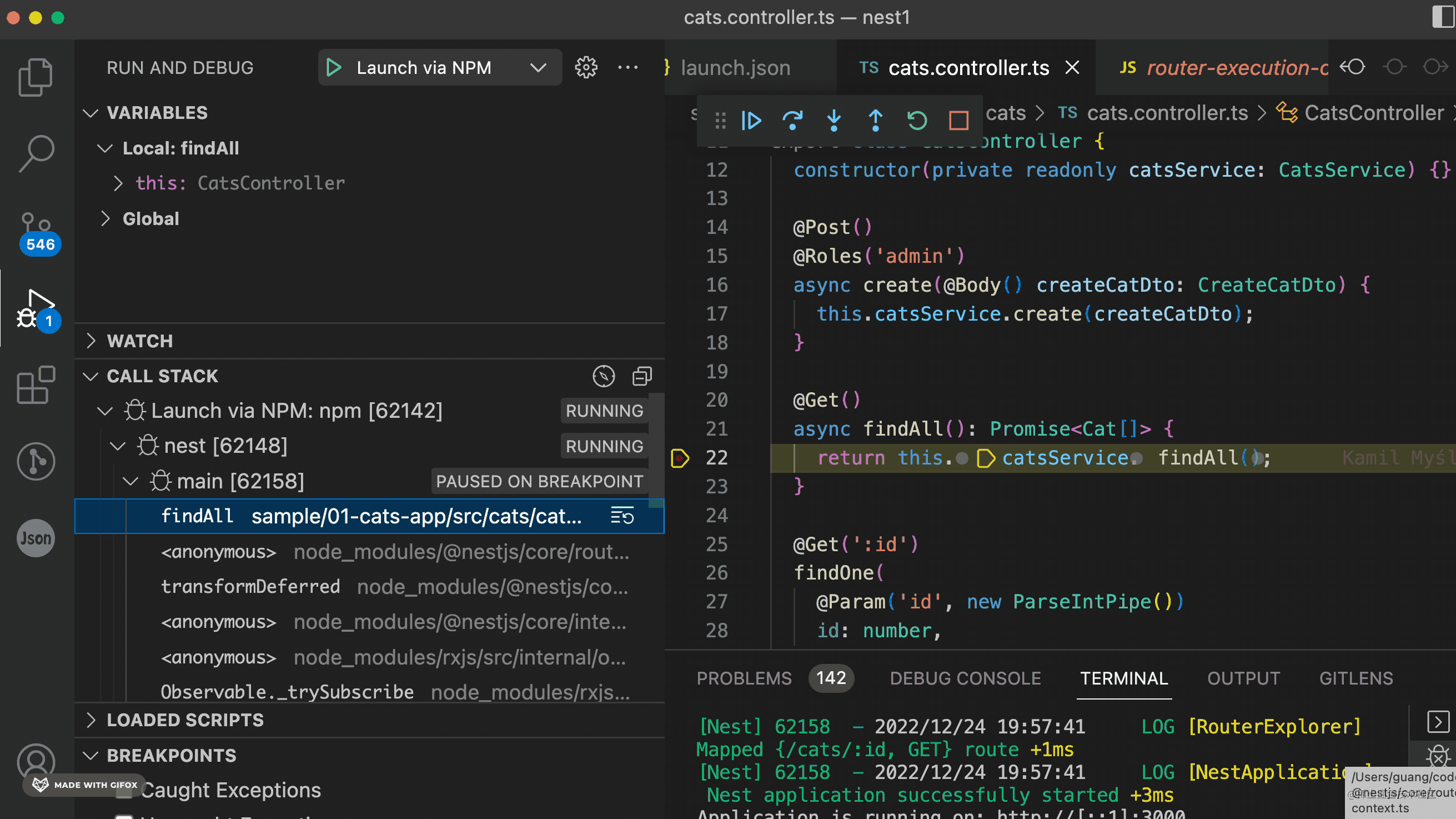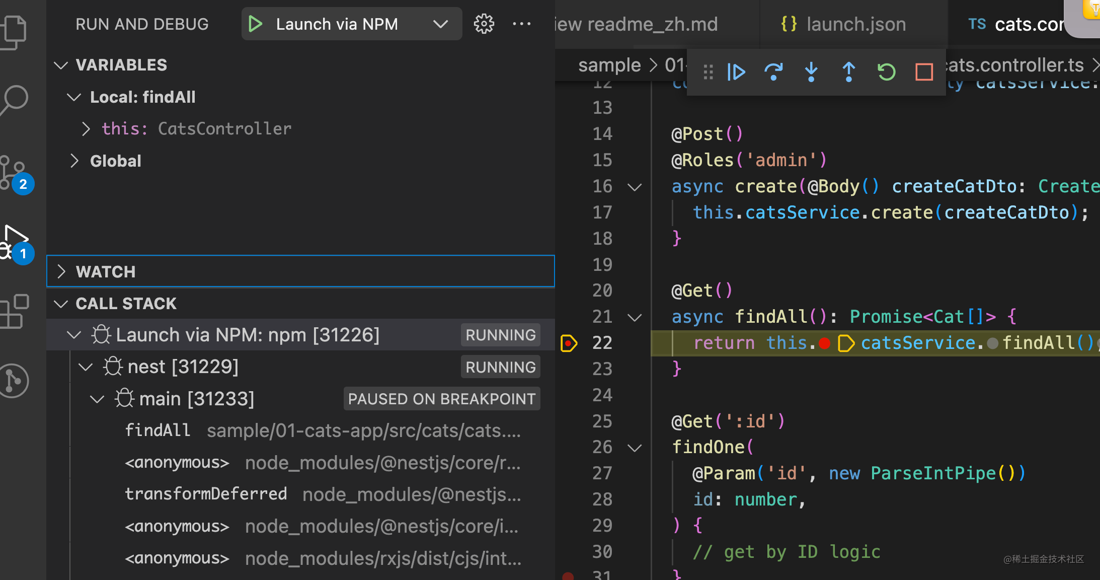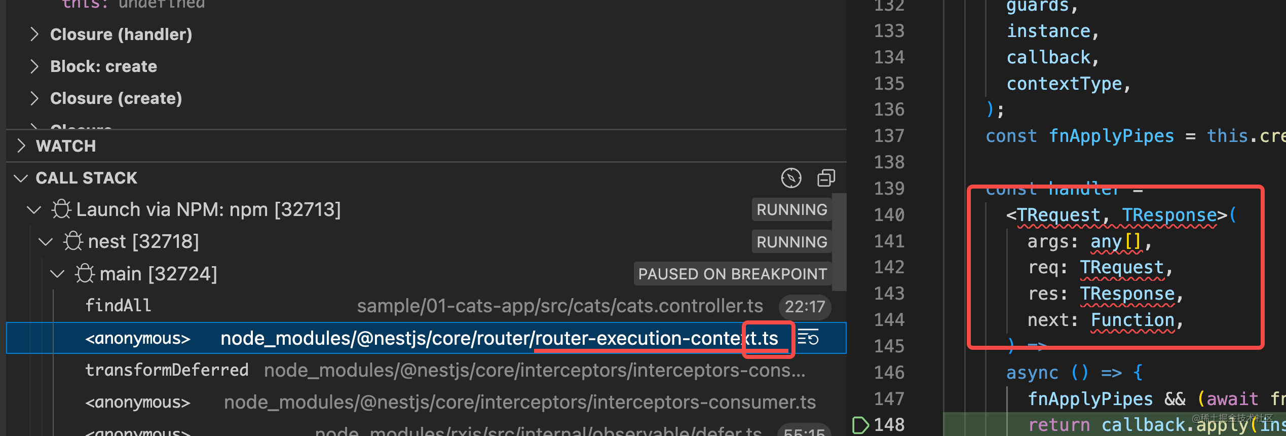 然后浏览器访问 http://localhost:3000/cats ,代码就会在断点处断住: