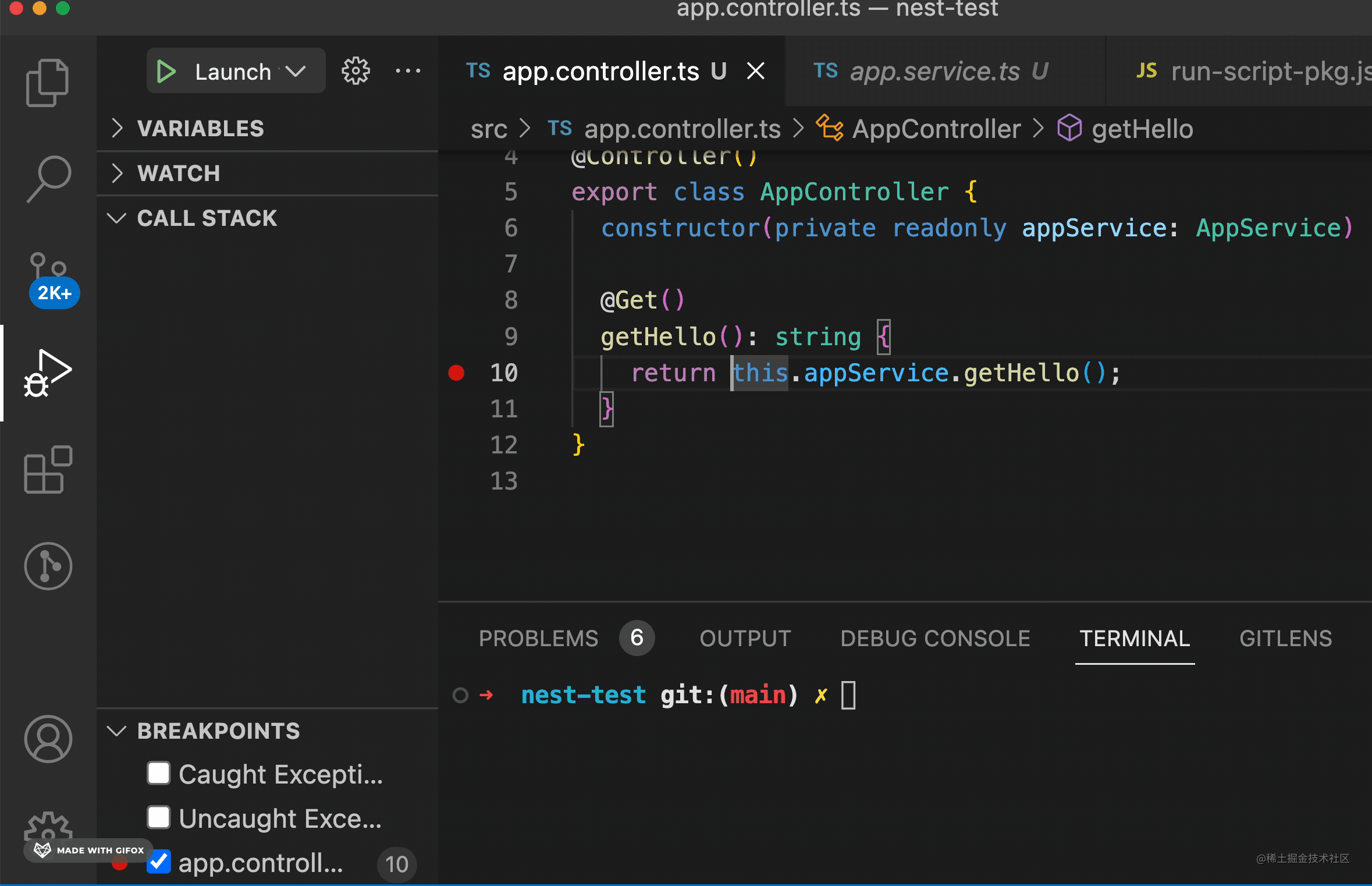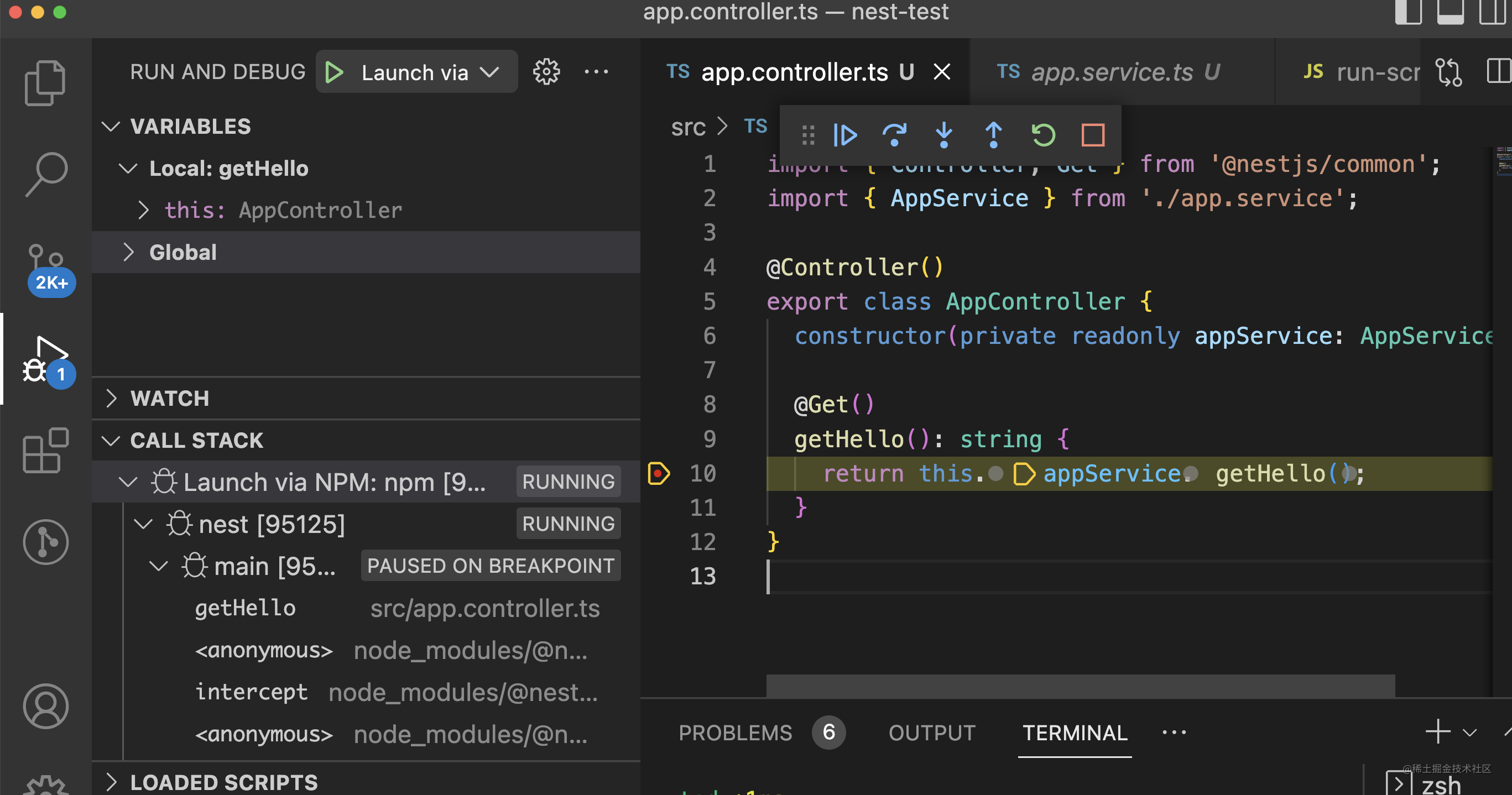 调试 Nest.js 项目就是用 npm 的方式启动调试配置,指定下 console 为 terminal 就可以了。