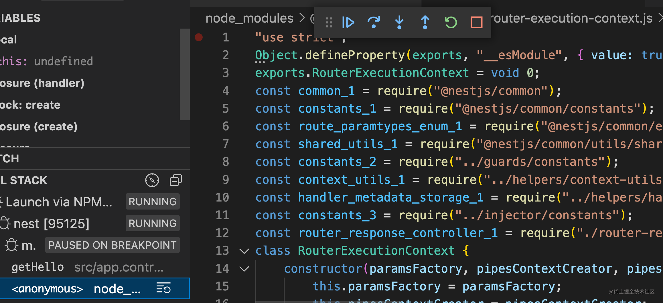 其实调用栈里,我们的代码之前的部分,就是 Nest.js 框架的代码: