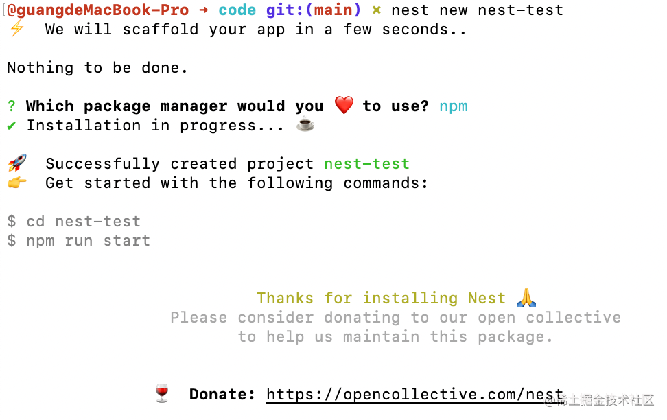 然后用 nest new nest-test 快速创建一个 nest 的项目。
