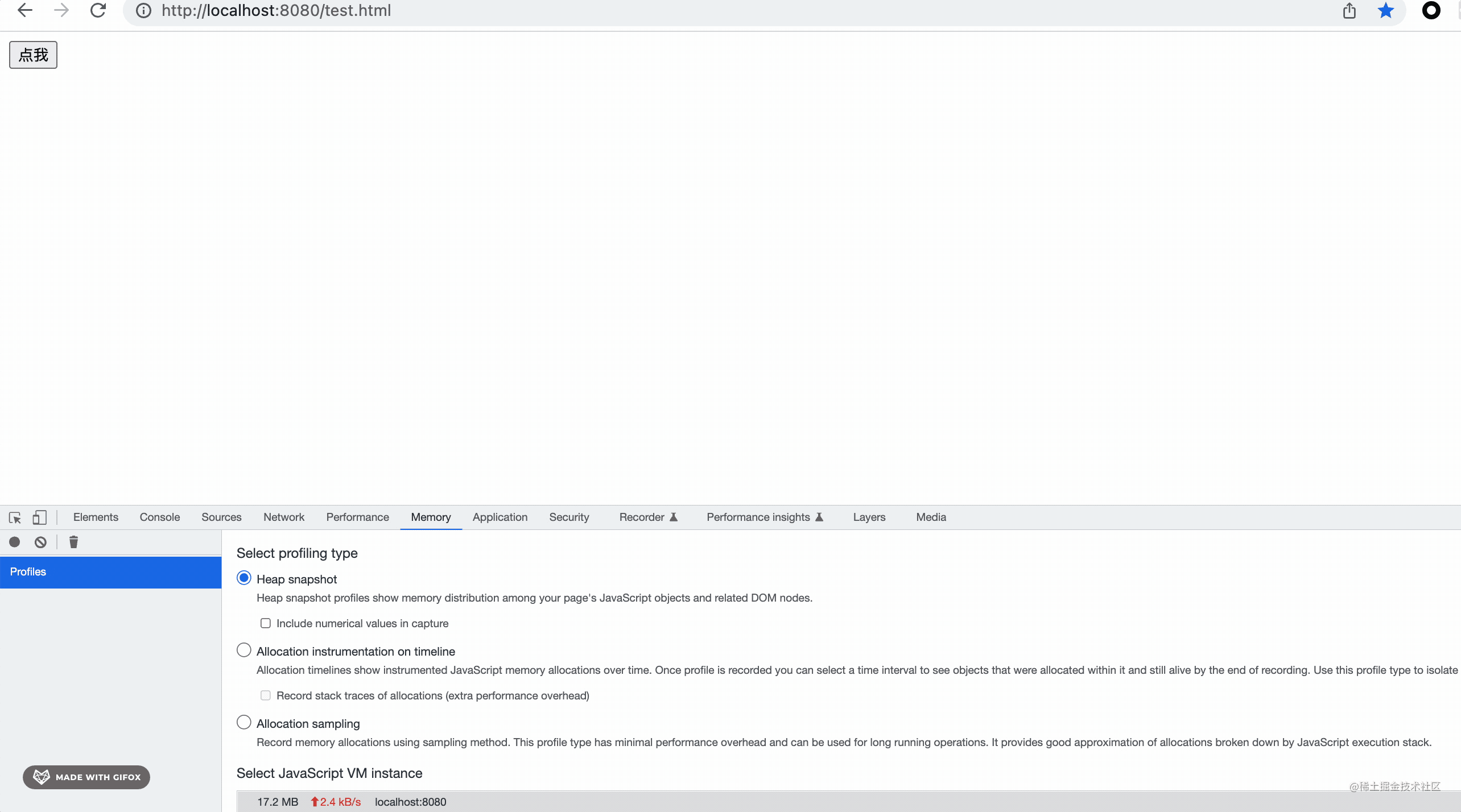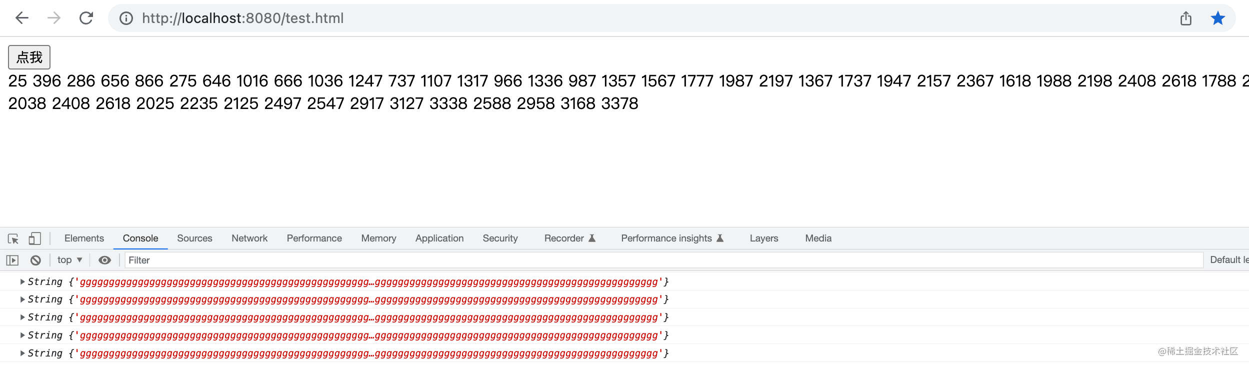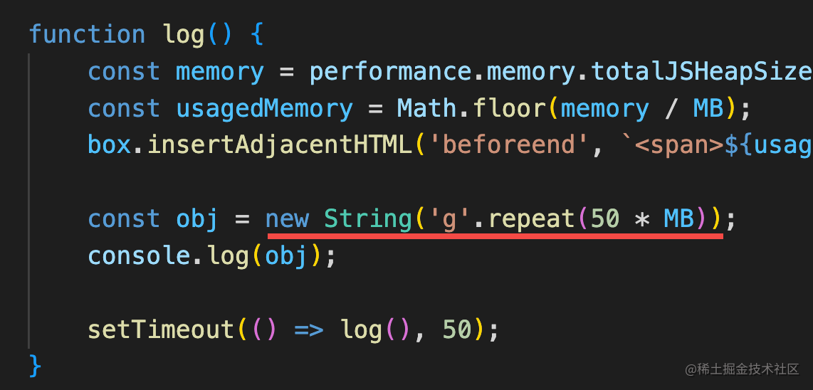 按钮点击的时候,拿到当前堆内存的大小。然后打印一个大字符串和堆内存大小。