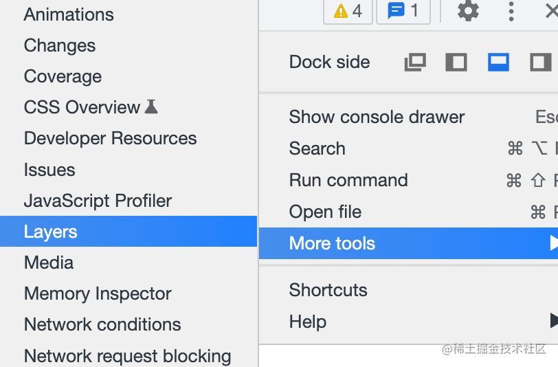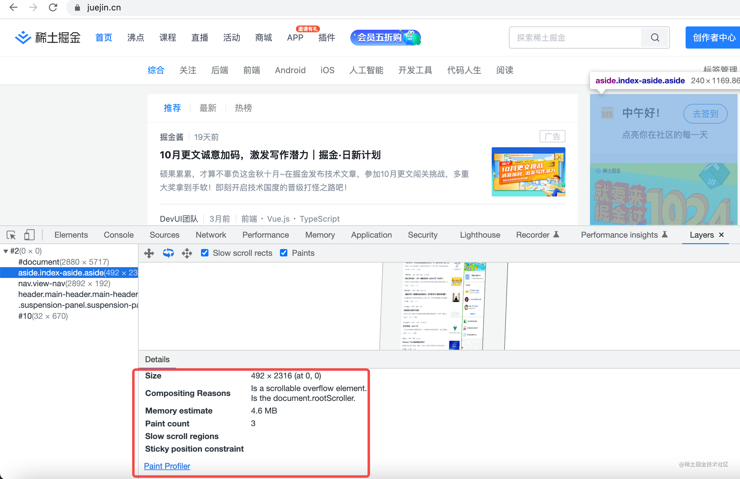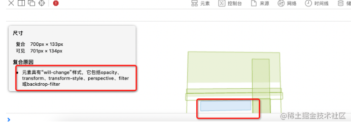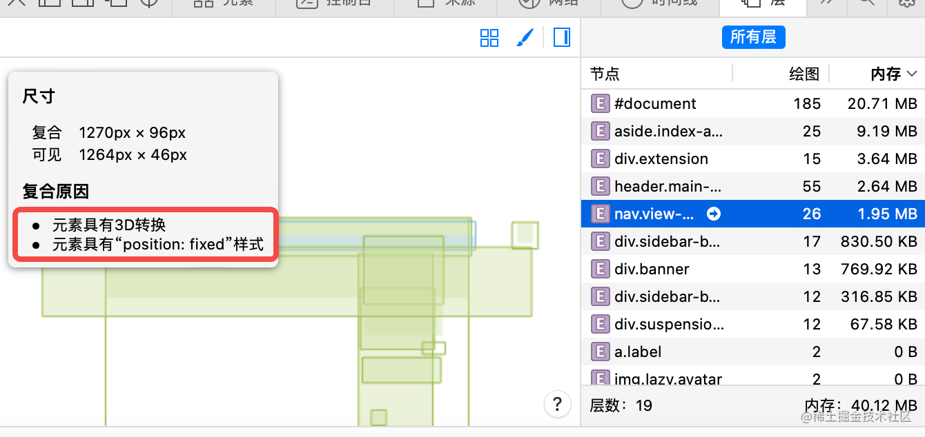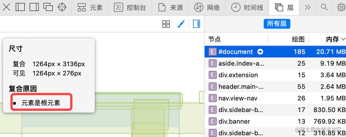 如果你需要优化渲染的性能,就需要把一些高频绘制的区域移到单独的图层里,比如加 will-change 属性,这时候就可以通过 Layers 工具来分析了。