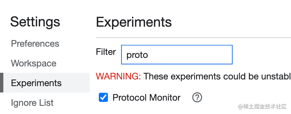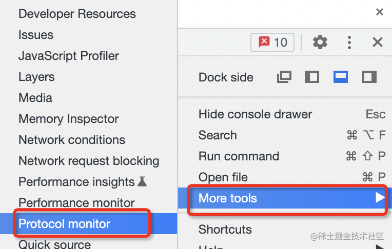 然后在 more tools 里打开 Protocol Monitor 面板: