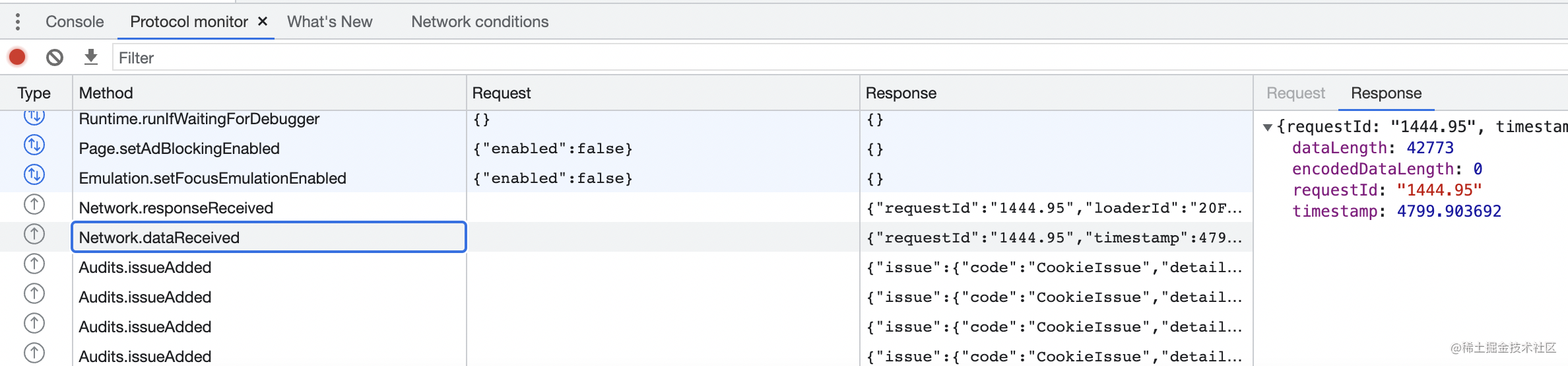 然后你就可以在 Protocol Monitor 面板里看到所有的 CDP 协议的数据交互了: