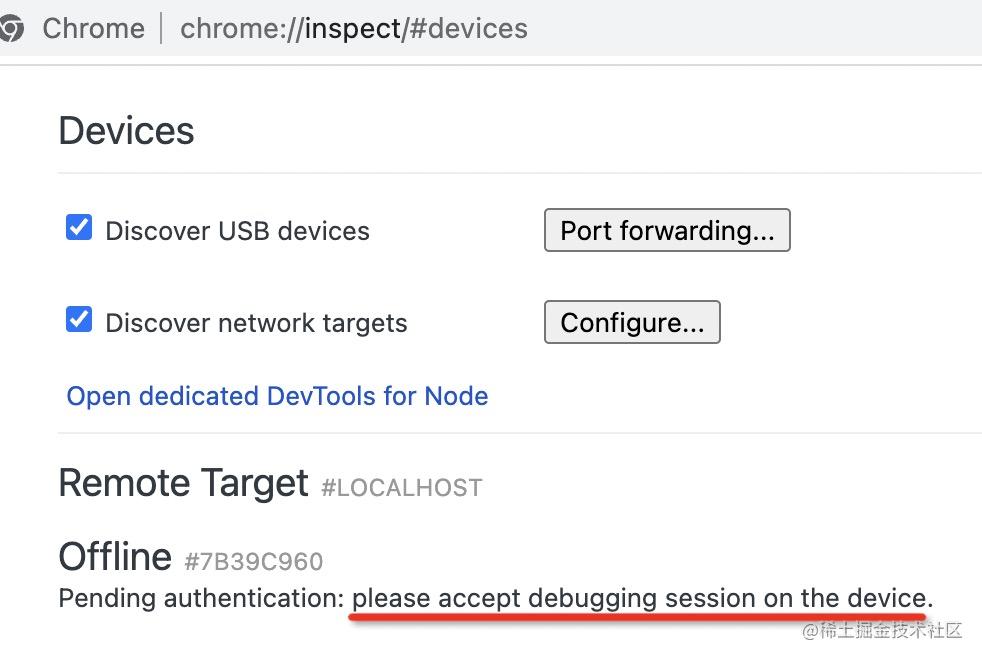 然后在 chrome 打开 chrome://inspect 页面,勾选 Discover USB devices(默认是勾选的):