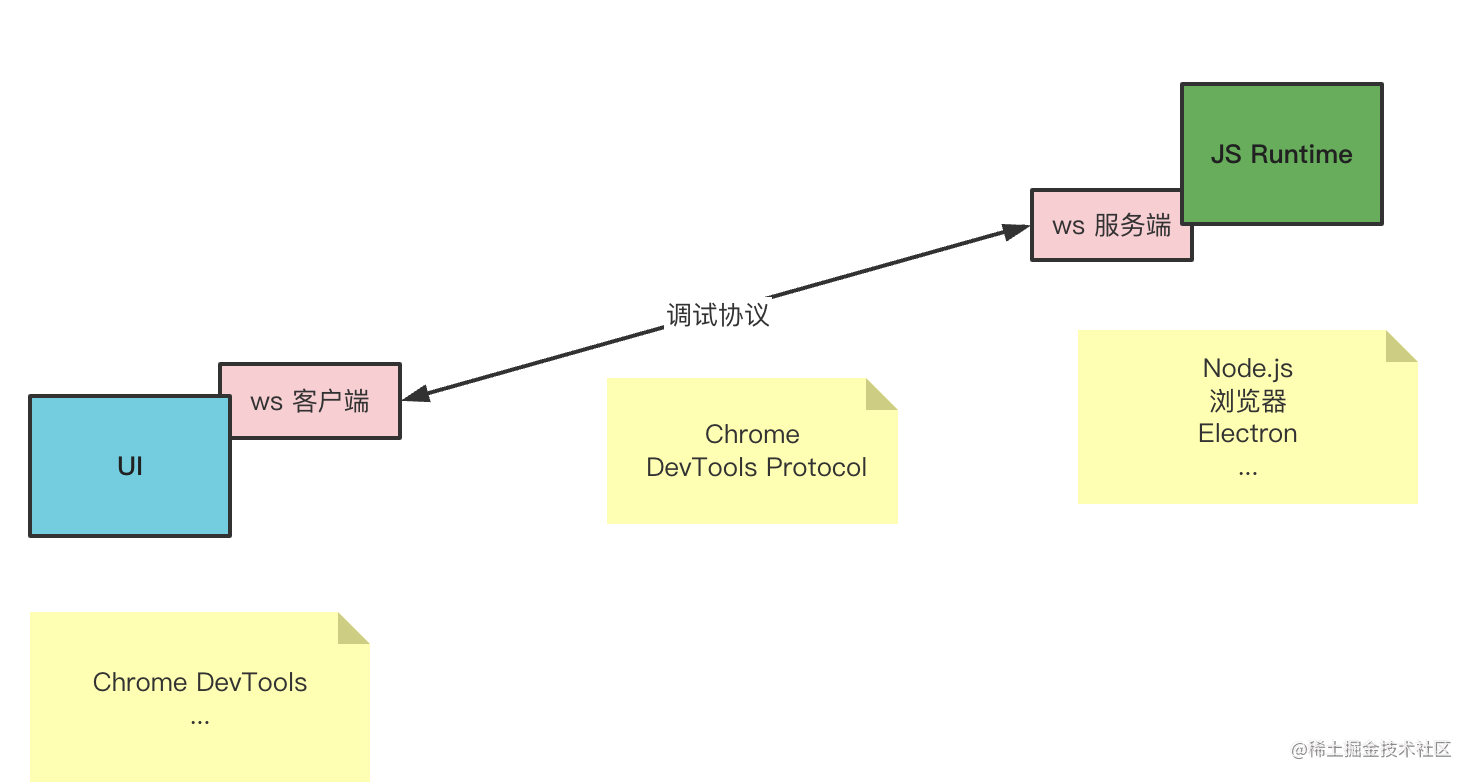 Chrome DevTools 被设计成了和 Chrome 分离的架构,两者之间通过 WebSocket 通信,设计了专门的通信协议: Chrome DevTools Protocol。