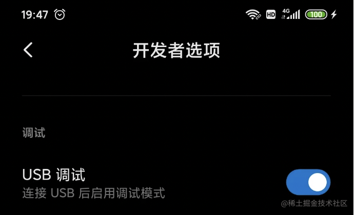 用数据线把安卓手机和电脑连接起来,在手机设置里打开 USB 调试: