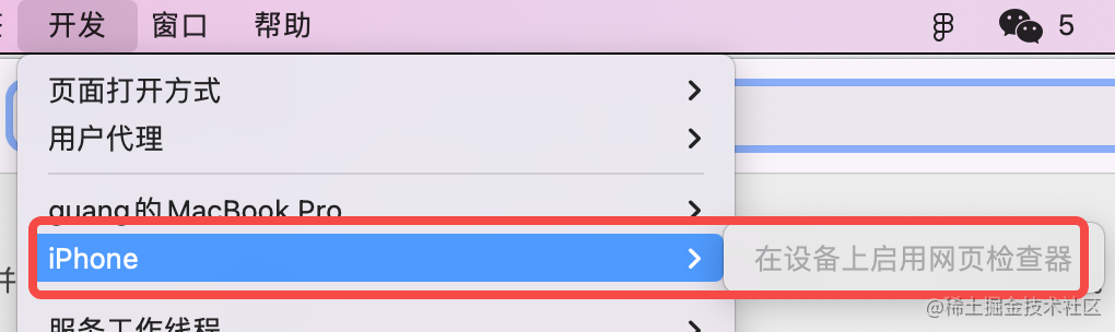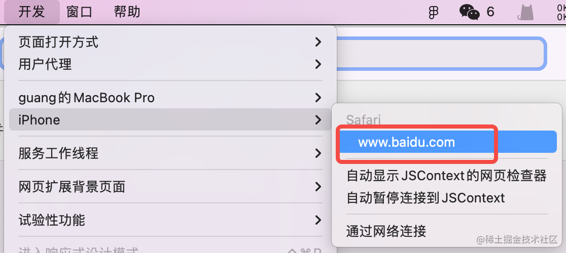 在电脑的 Safari 浏览器的开发菜单里就会显示出这个网页: