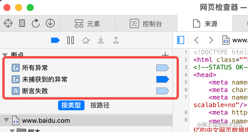 比如可以在所有未捕获的异常处断住,这是异常断点。