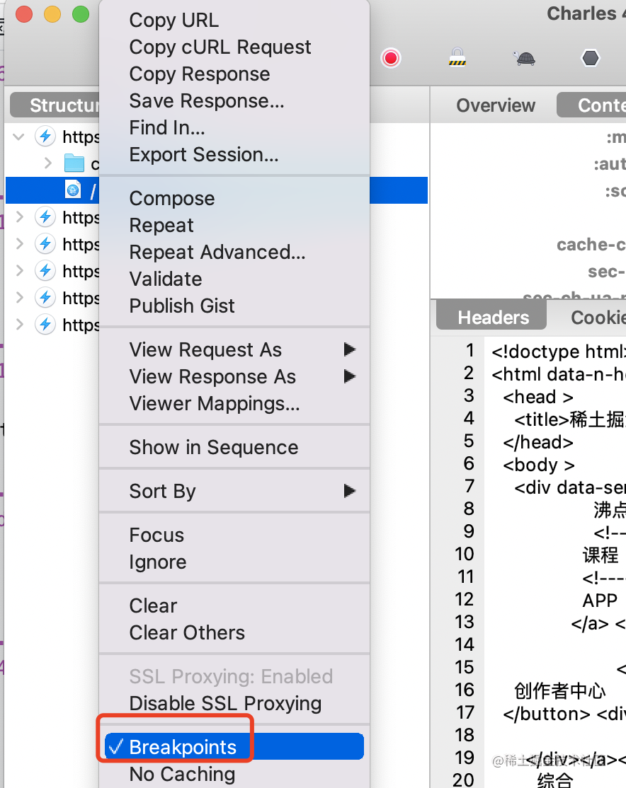 现在能够抓 https 包了,但是还不够,现在只能看,很多情况下我们是希望能修改一下请求和响应内容的,这时候就要用断点功能了: