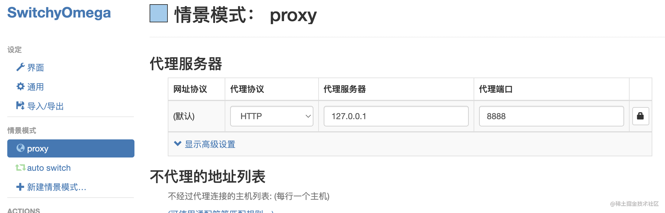 如果想切换代理服务器或者设置有的页面不走代理,可以用 Chrome 插件 SwitchyOmega 来控制。
