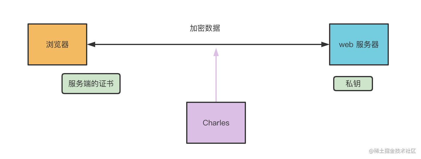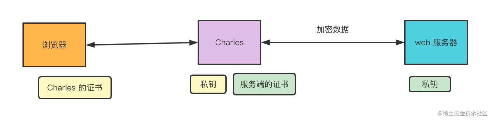 Charles 自己用服务端的证书来和服务端通信,然后给浏览器一个自己的证书,这样就能解密传输的内容,拿到明文数据了。