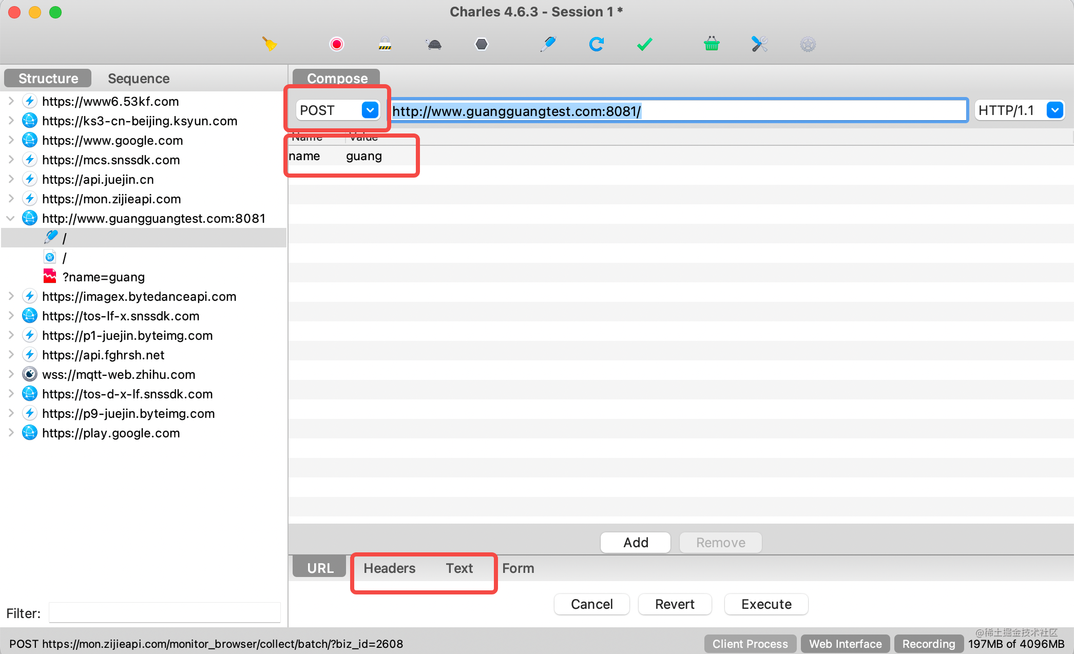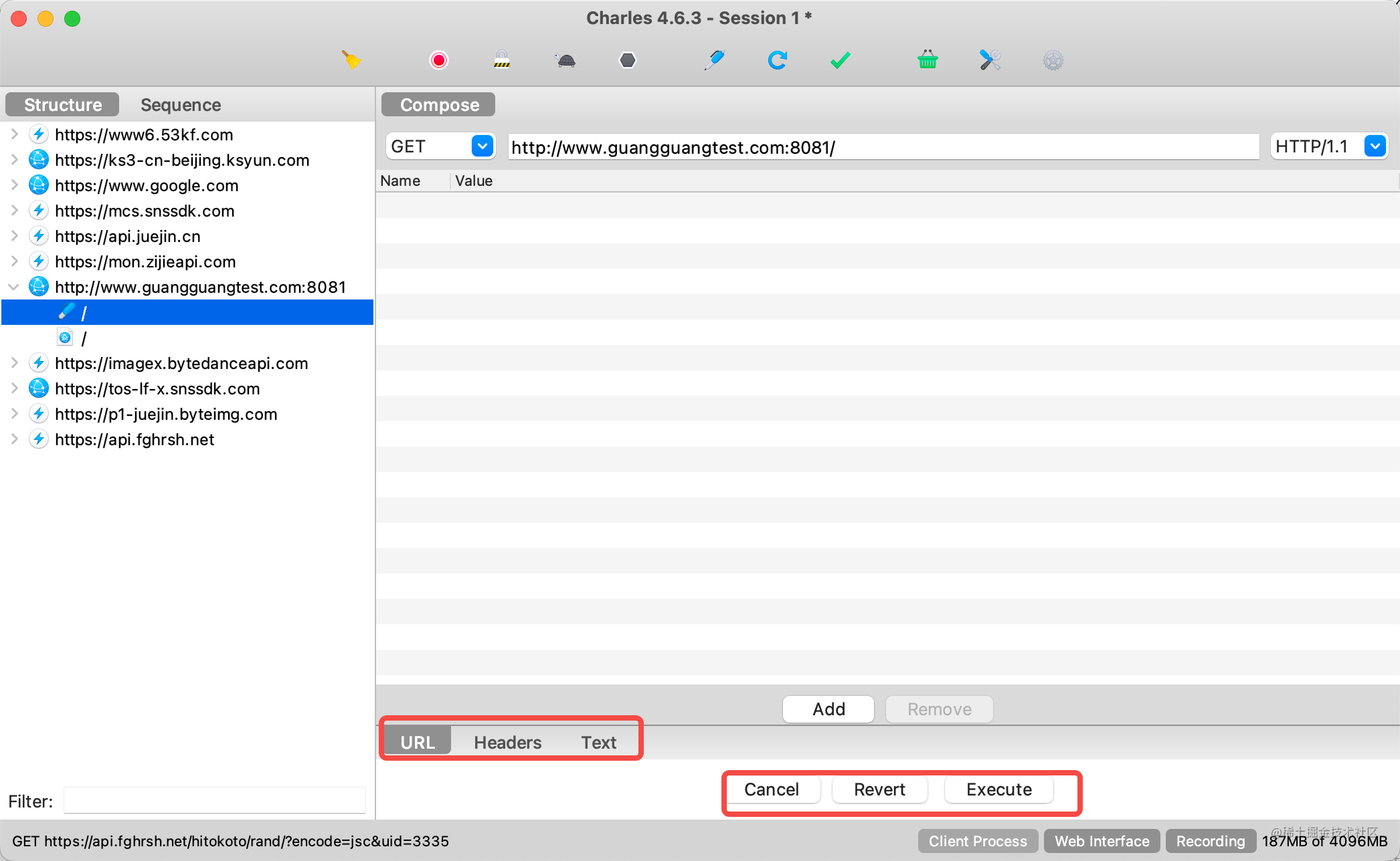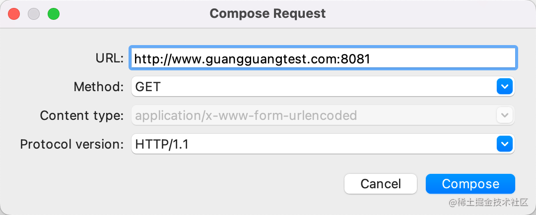 点击 Tools > Compose New,创建一个 www.guangguangtest.com:8081 的请求: