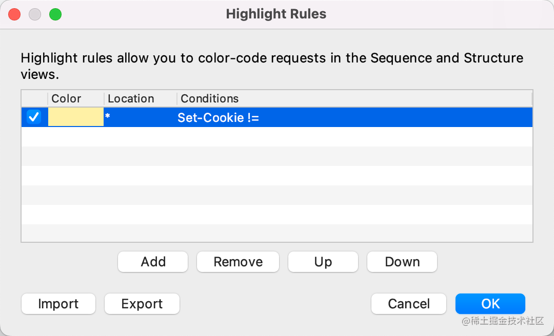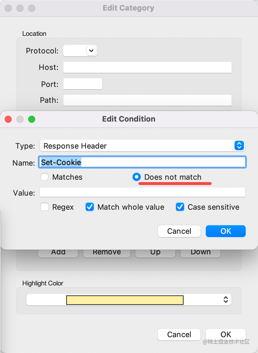 更有用的是可以根据条件来高亮,比如我设置所有 Set-Cookie 的 header 不为空的响应都设置黄色。