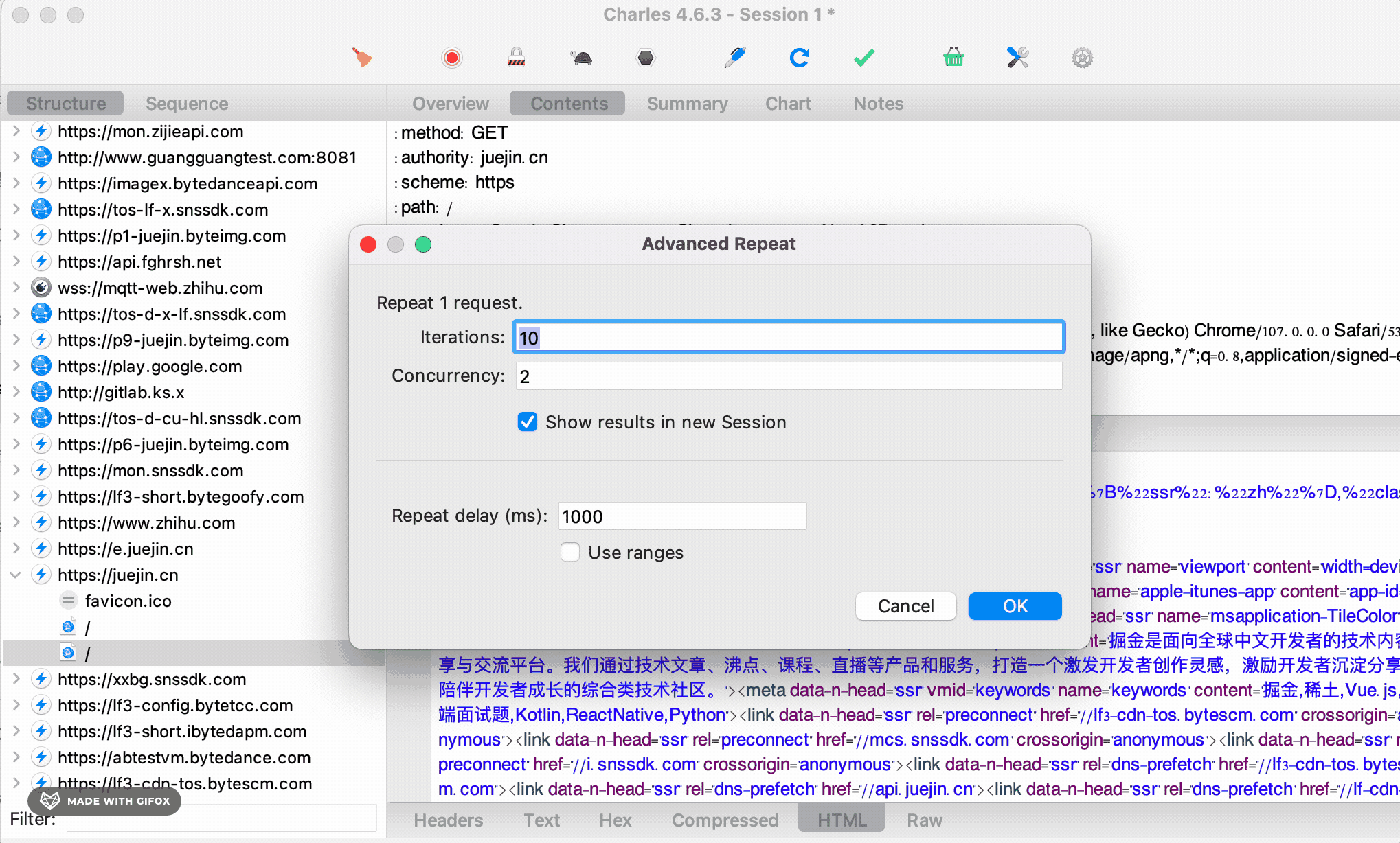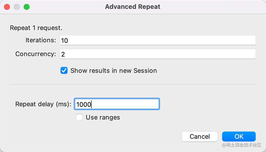 比如重复 10 次、两个并发,重复间隔为 1000ms,在新的 session 里展示结果。