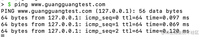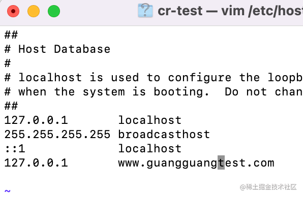 执行 sudo vim /etc/hosts 修改 hosts 文件,添加一条 www.guangguangtest.com 到 127.0.0.1 的映射: