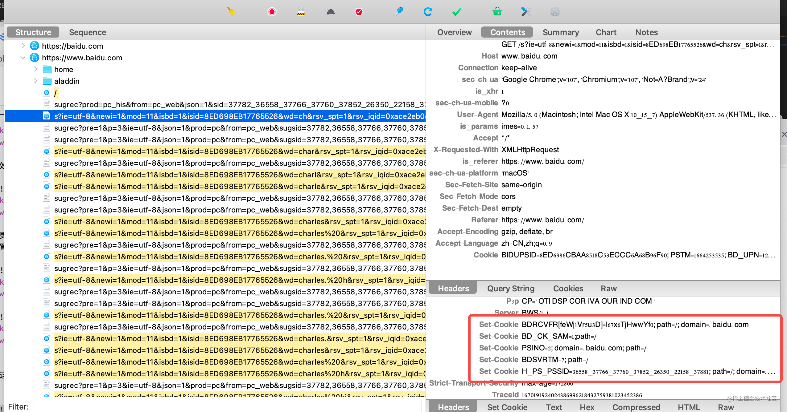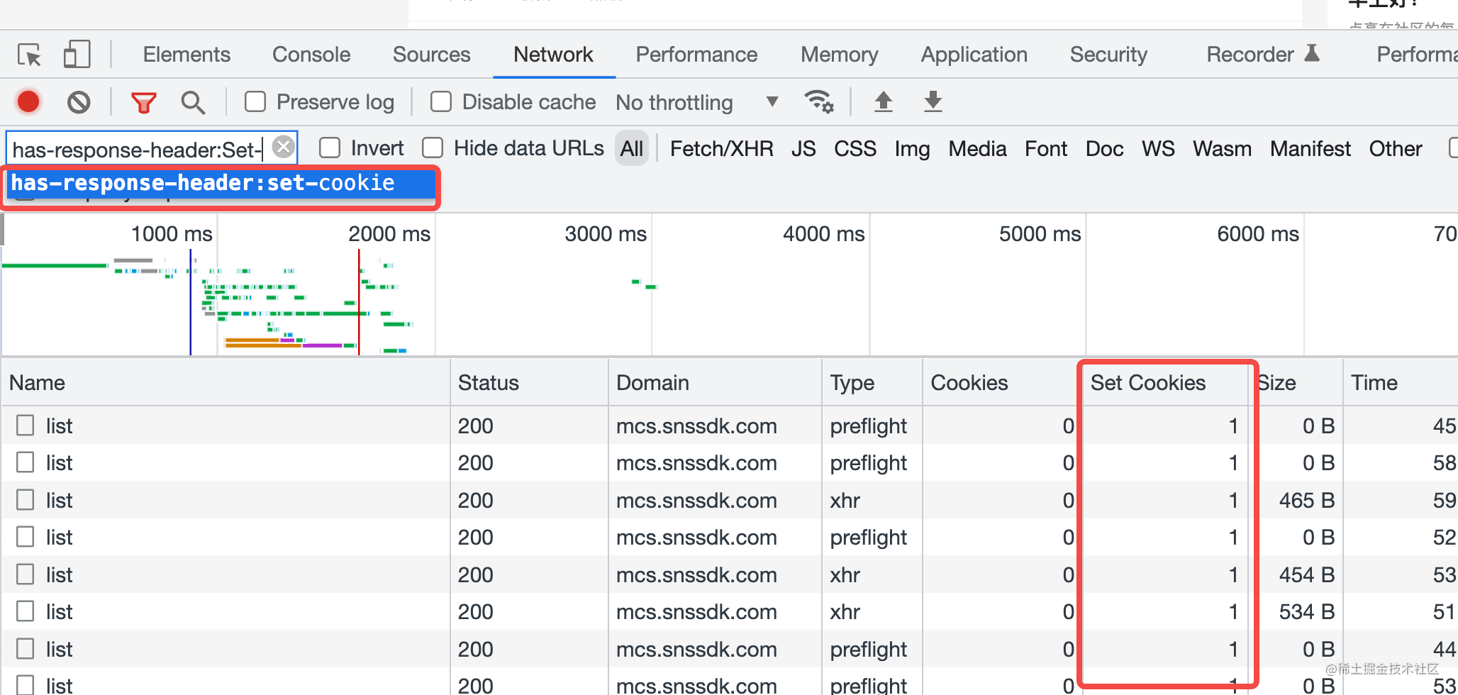 这样所有响应有 Set-Cookie 的 header 的请求都高亮了: